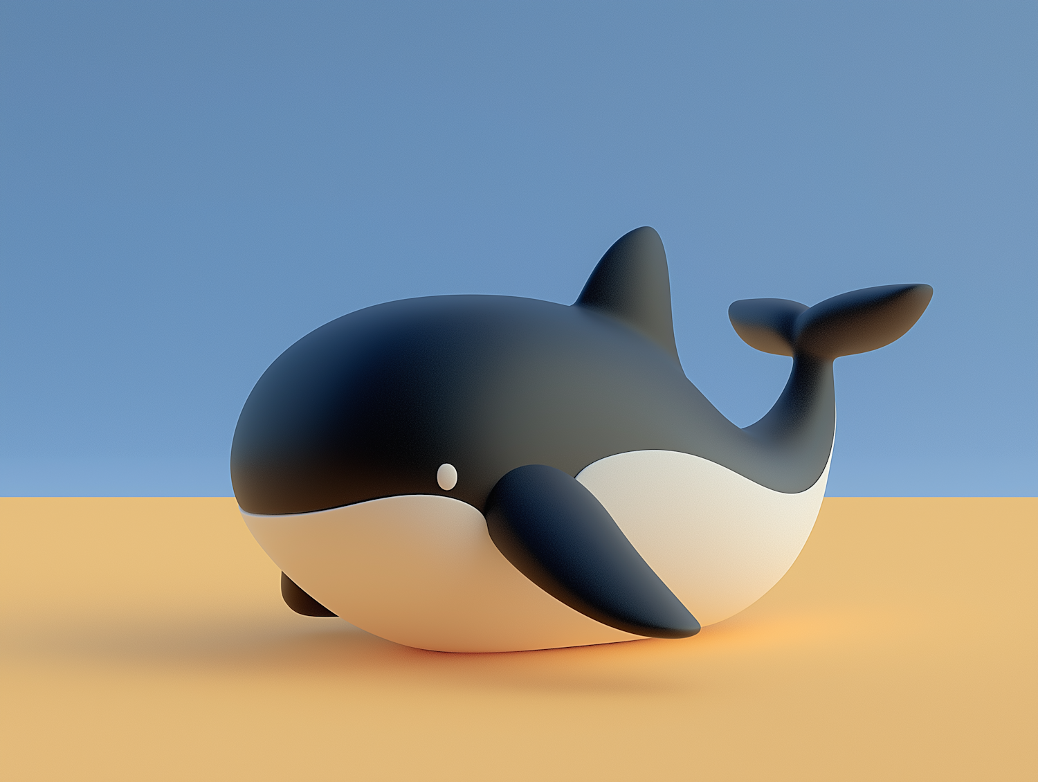 Charming 3D illustration of a cartoon orca whale with a glossy finish, set against a minimalistic blue and beige background.
