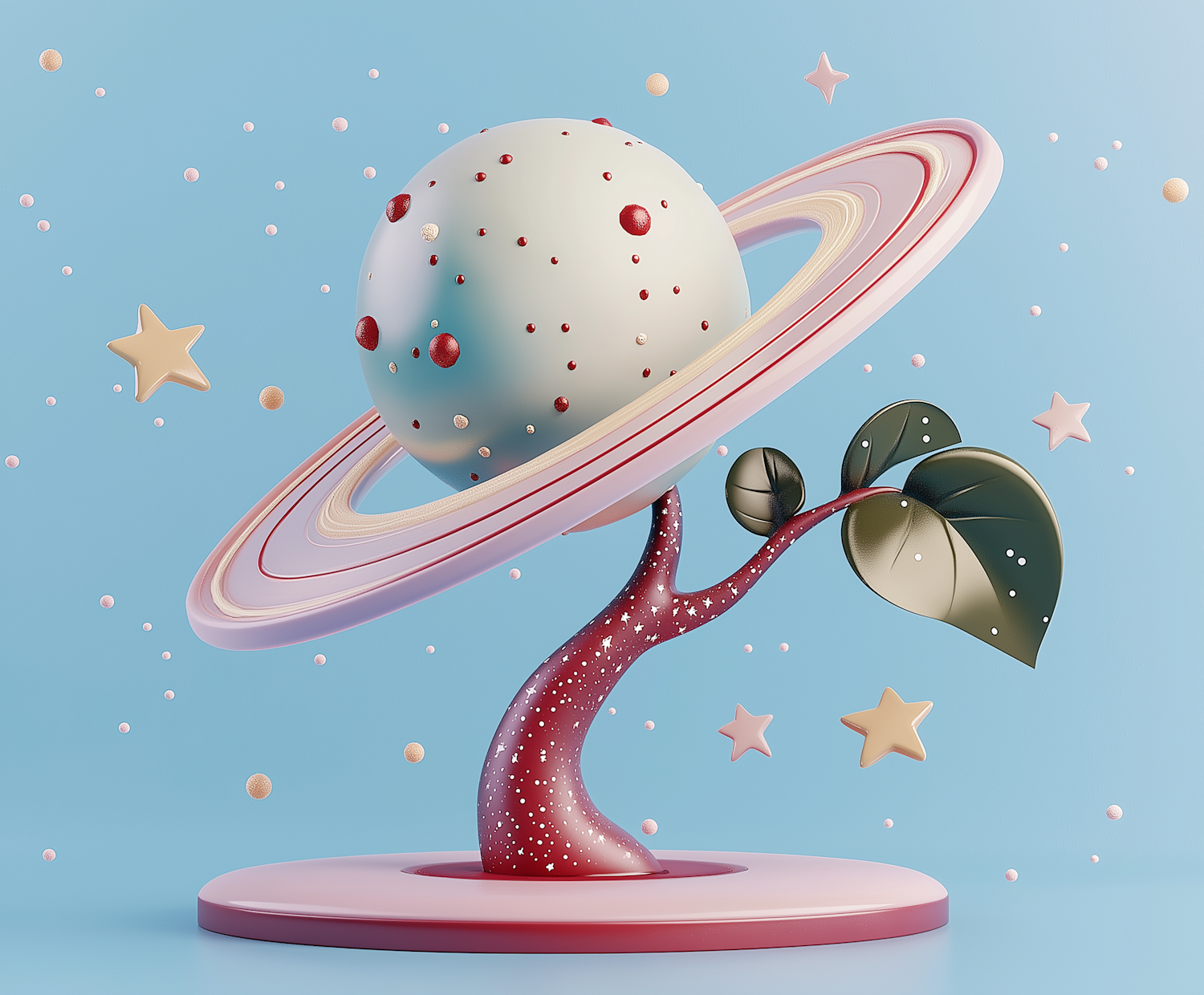 Whimsical 3D illustration of a planet with rings on a tree trunk, surrounded by stars and dots on a soft blue background.