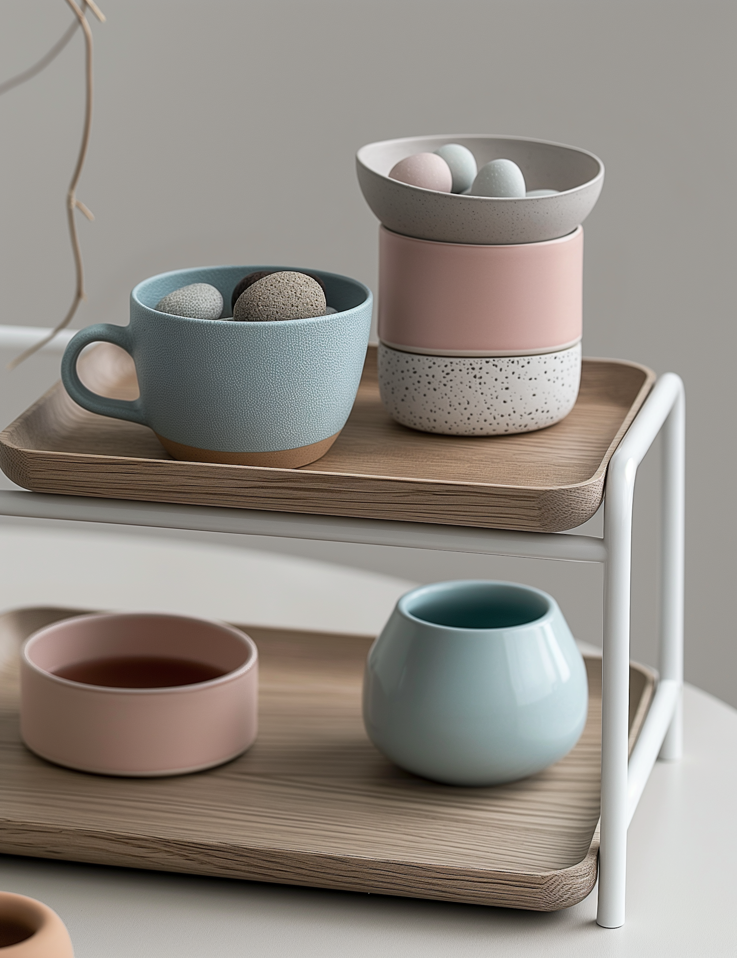 Minimalist ceramic kitchenware in pastel colors on a wooden stand, featuring mugs, bowls, and vases with smooth stones.