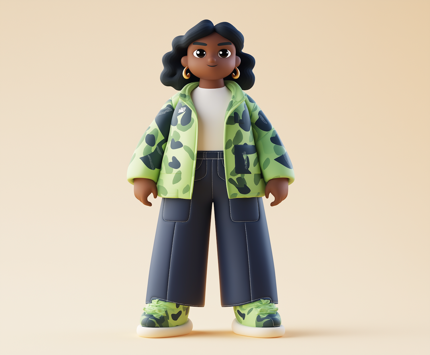 Stylized 3D character with blurred face, wearing green camo jacket, dark jeans, and matching shoes. Features gold hoop earrings.