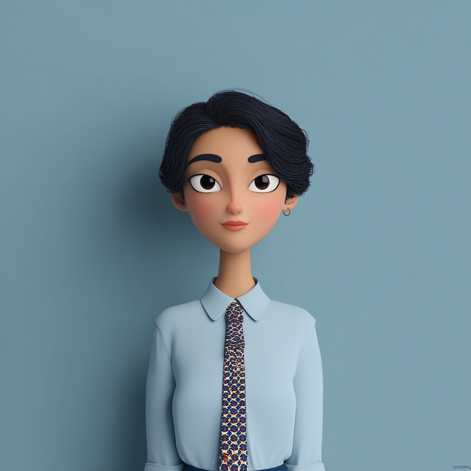 Stylized 3D character with short dark hair, light blue shirt, and patterned tie, set against a plain blue background.