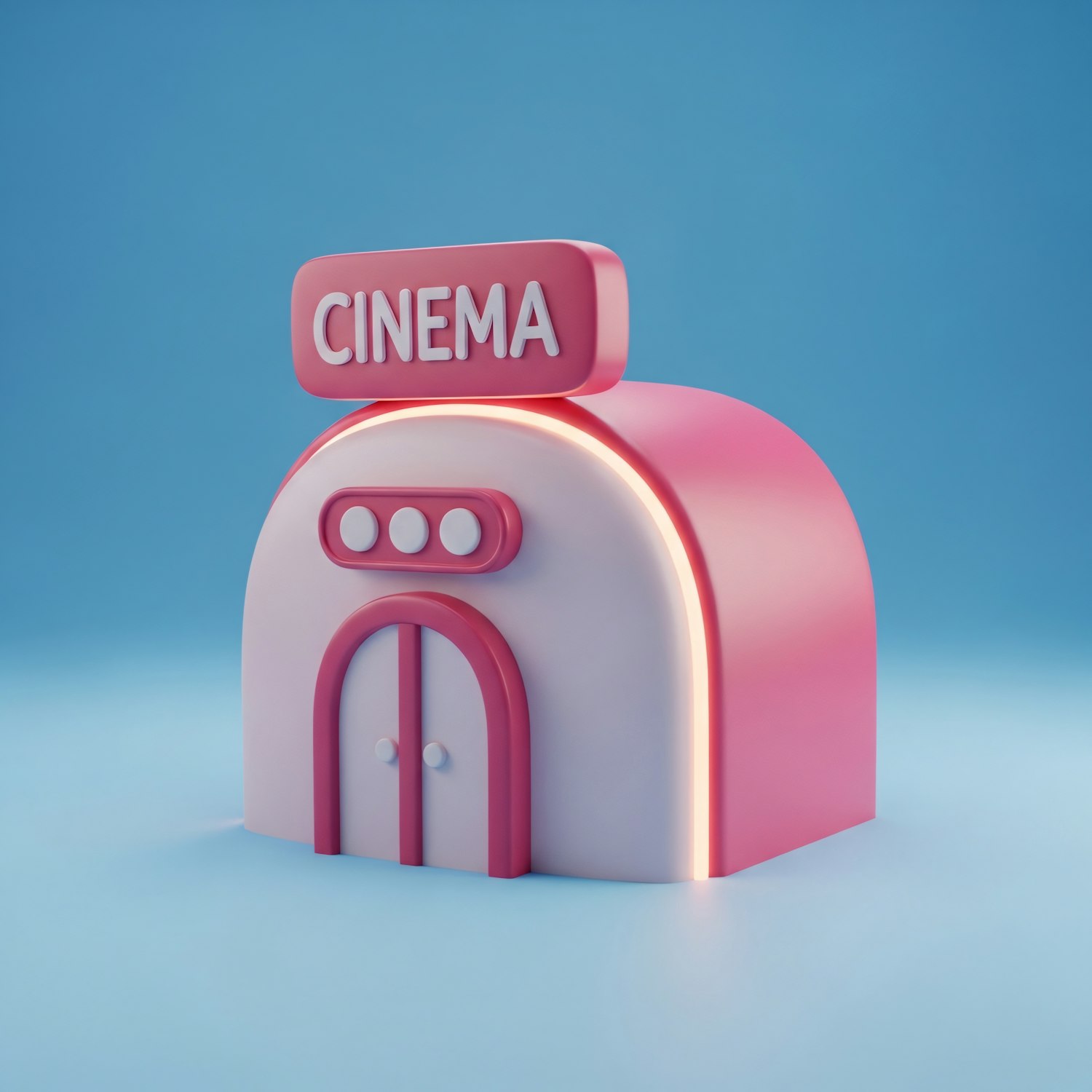 A 3D illustration of a pink and white cinema building with a bold 'CINEMA' sign, set against a clean blue background.