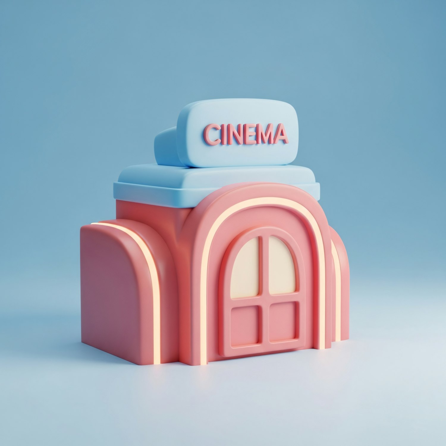 A charming 3D model of a pastel-colored cinema building with a playful design and a clean blue background.