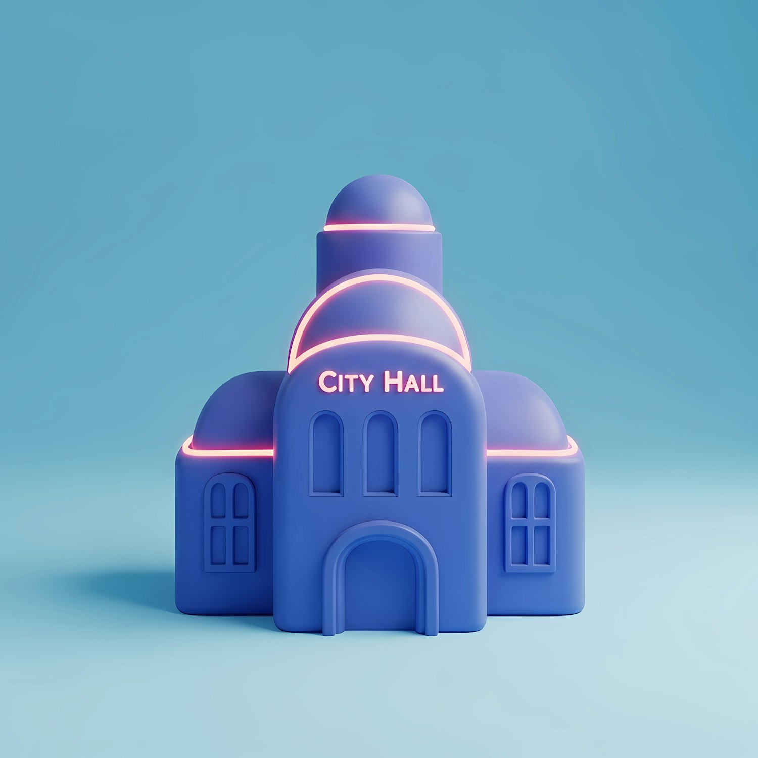A minimalist 3D city hall model in blue with neon pink accents, set against a light blue background for a modern look.