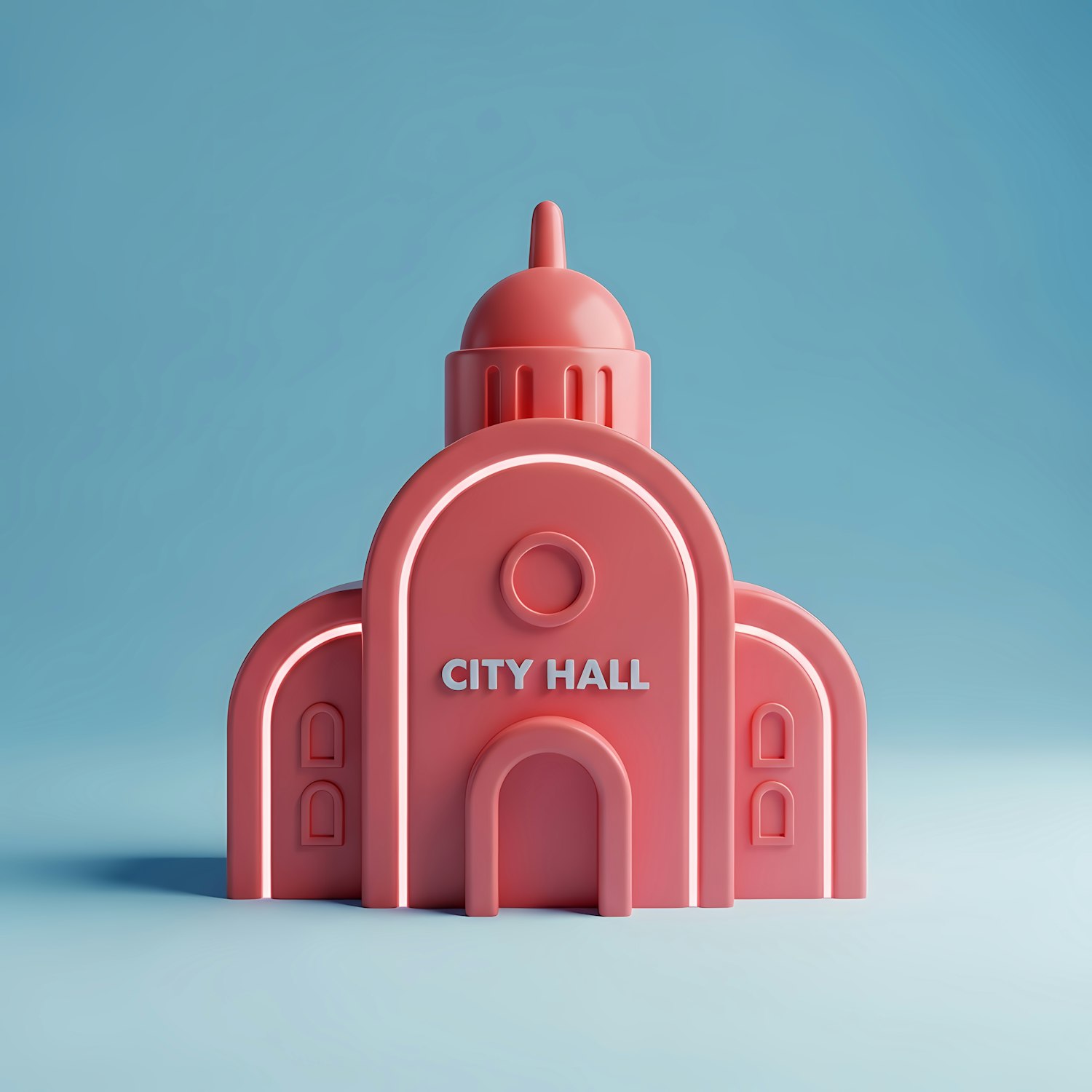 A vibrant 3D model of a city hall building in coral pink with a dome and arched features, set against a light blue background.
