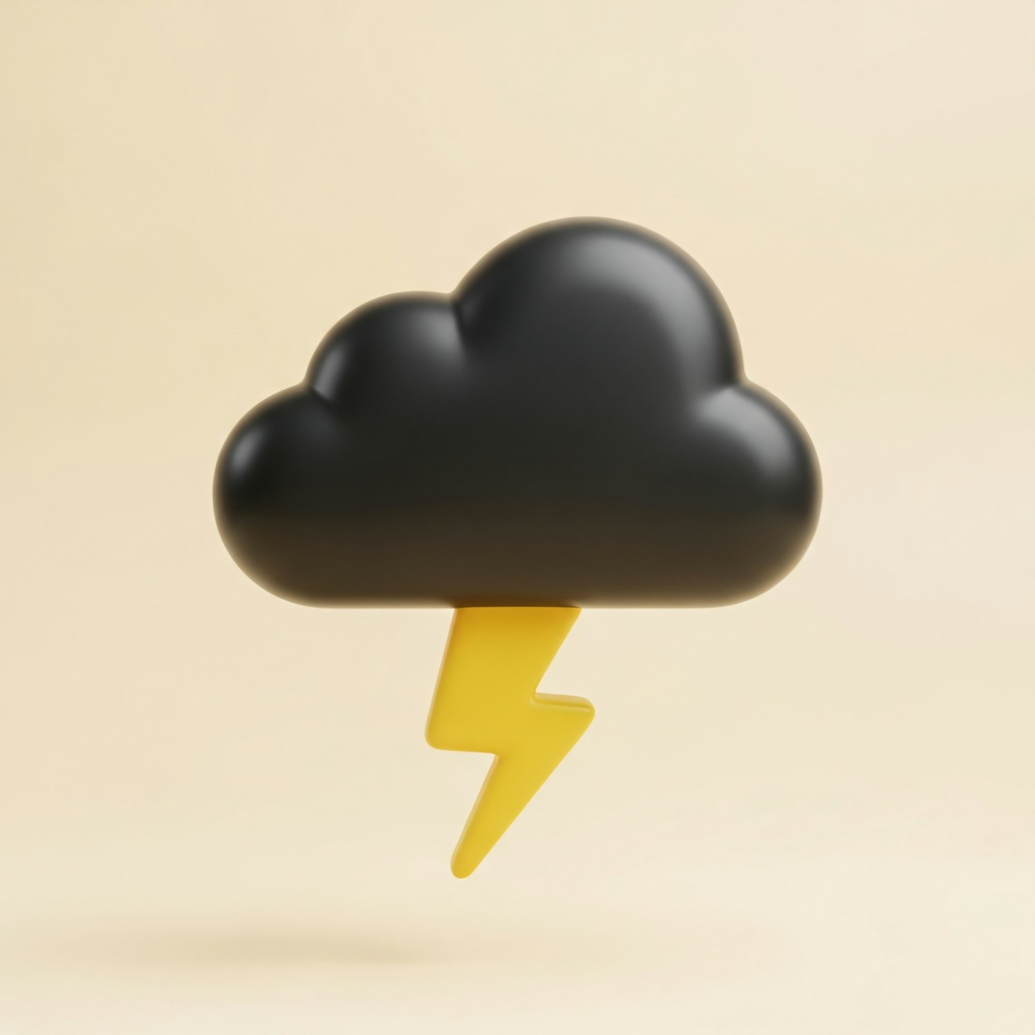 A sleek 3D illustration of a black cloud with a yellow lightning bolt on a beige background, perfect for weather or design themes.