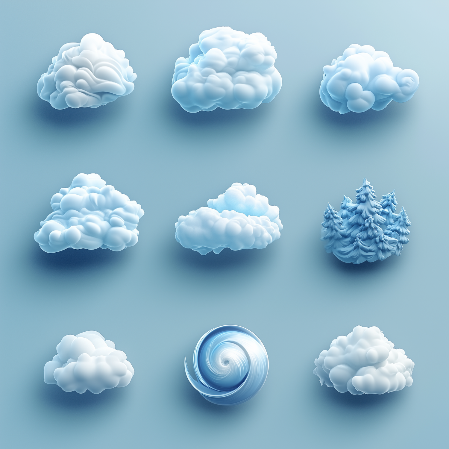 Stylized cloud and weather-themed illustrations, including fluffy clouds, a vortex, and textured pine trees on a light blue background.