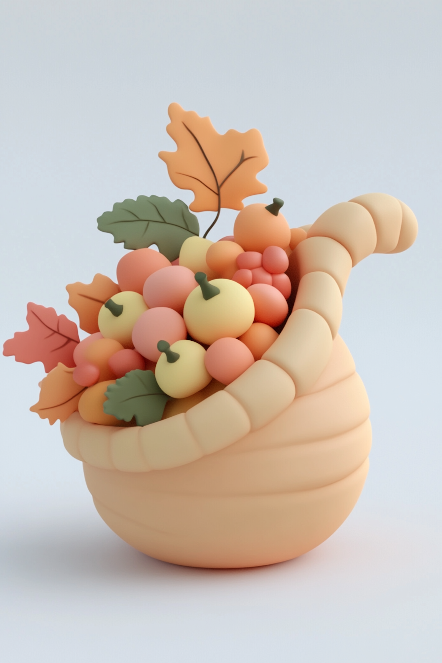 3D illustration of a pastel cornucopia filled with stylized fruits and leaves, showcasing autumn colors and whimsical design.