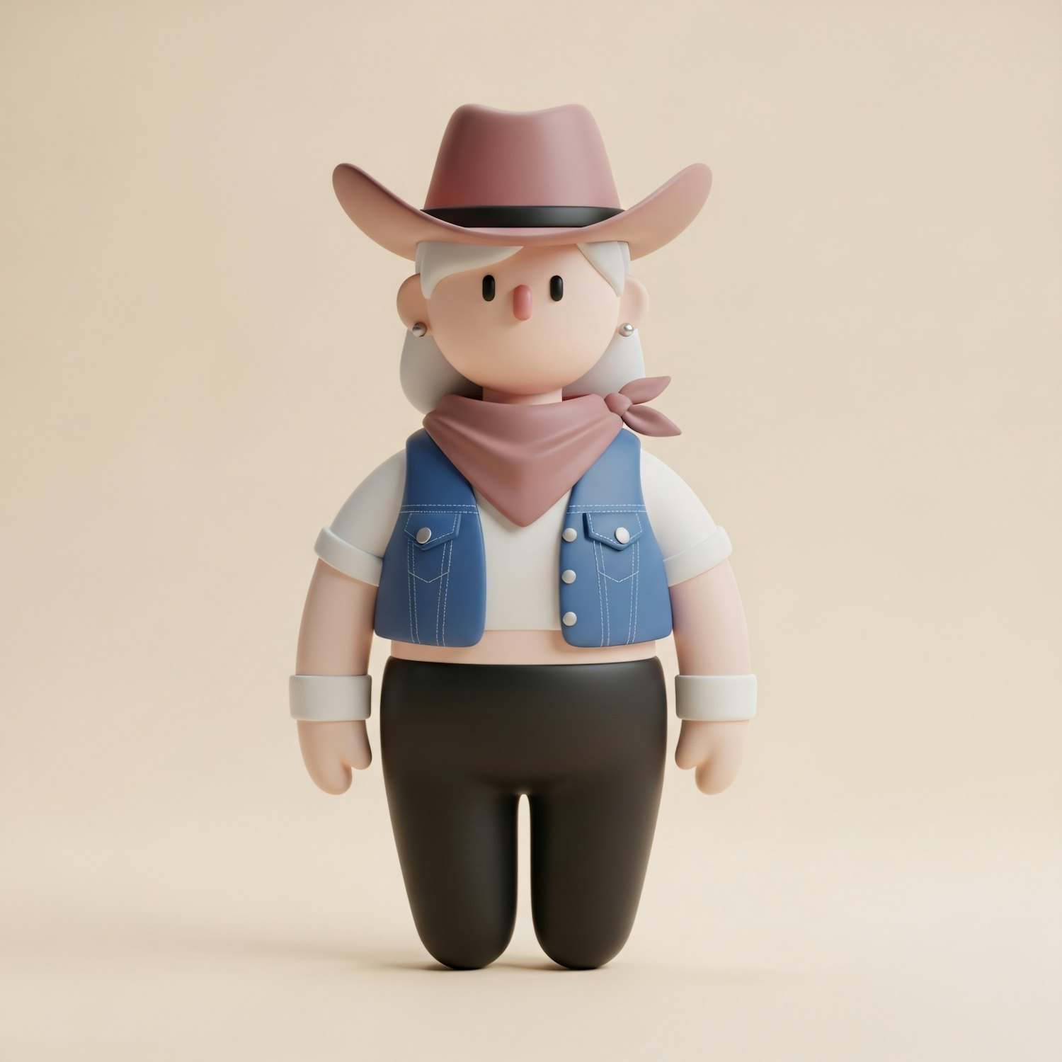 A charming 3D cowboy character with a pink hat, blue vest, and pink scarf, set against a beige background.