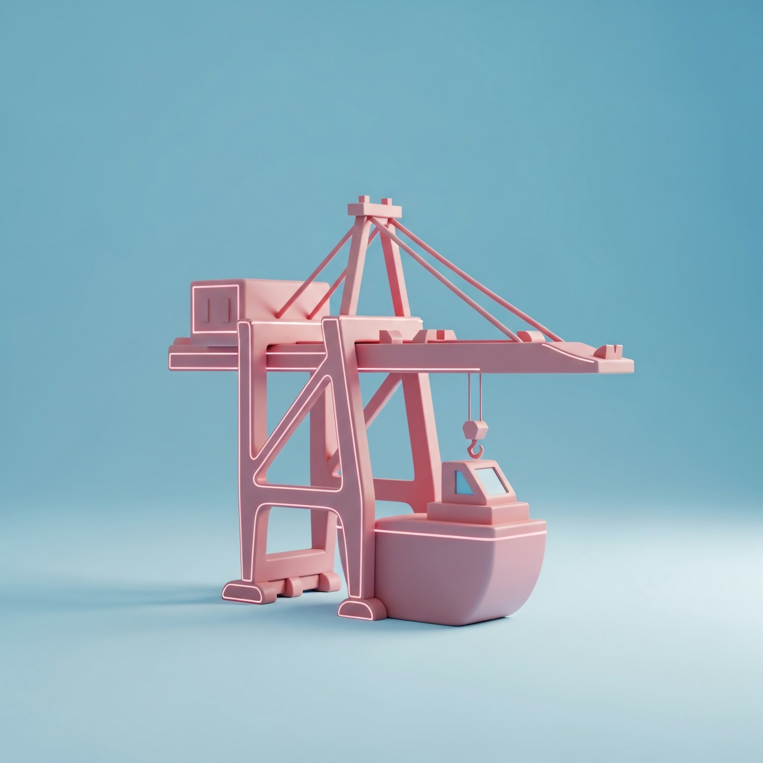 A pastel pink 3D crane model on a light blue background, showcasing a minimalistic and toy-like design with smooth, clean lines.