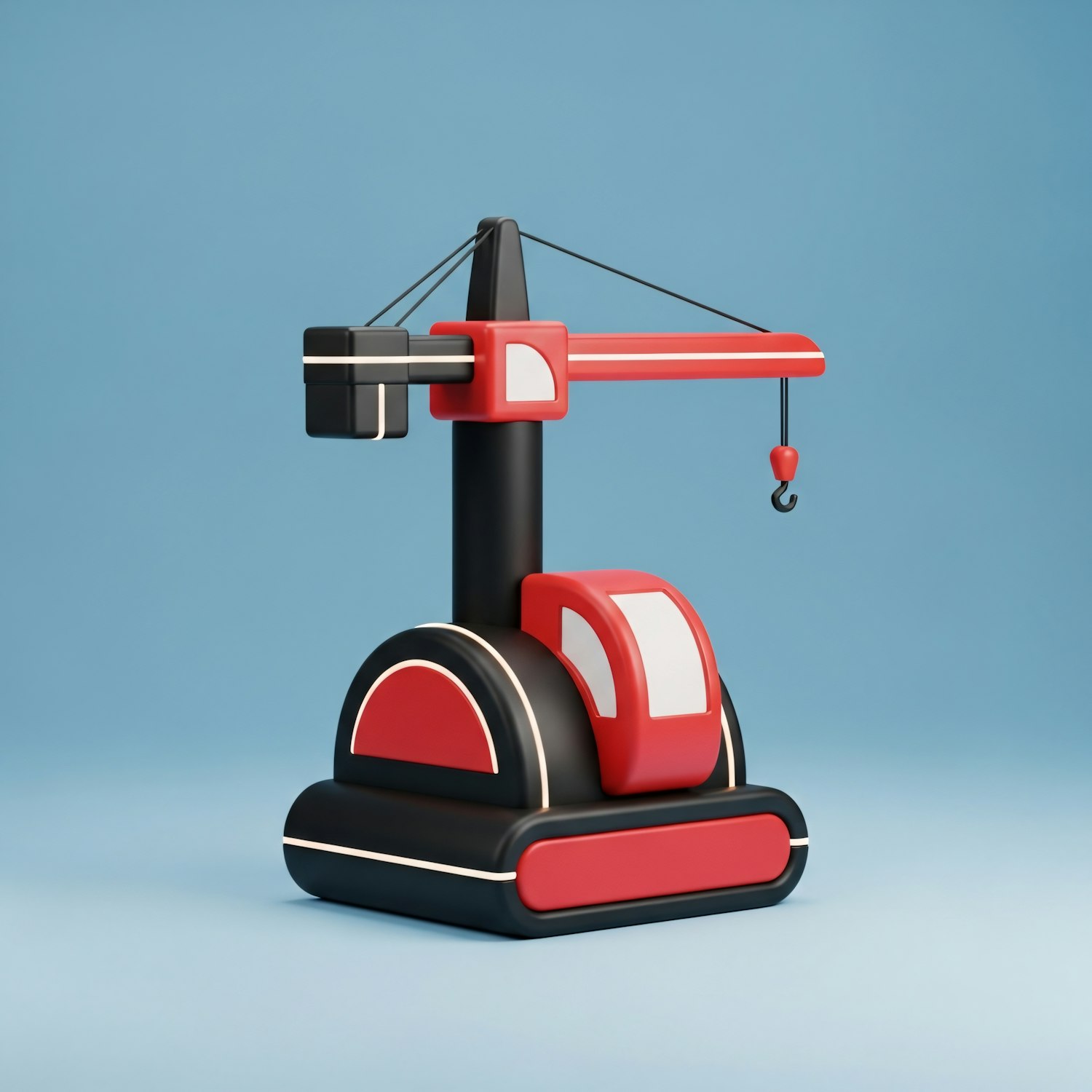 A sleek 3D model of a red and black crane with a modern design, set against a plain blue background.