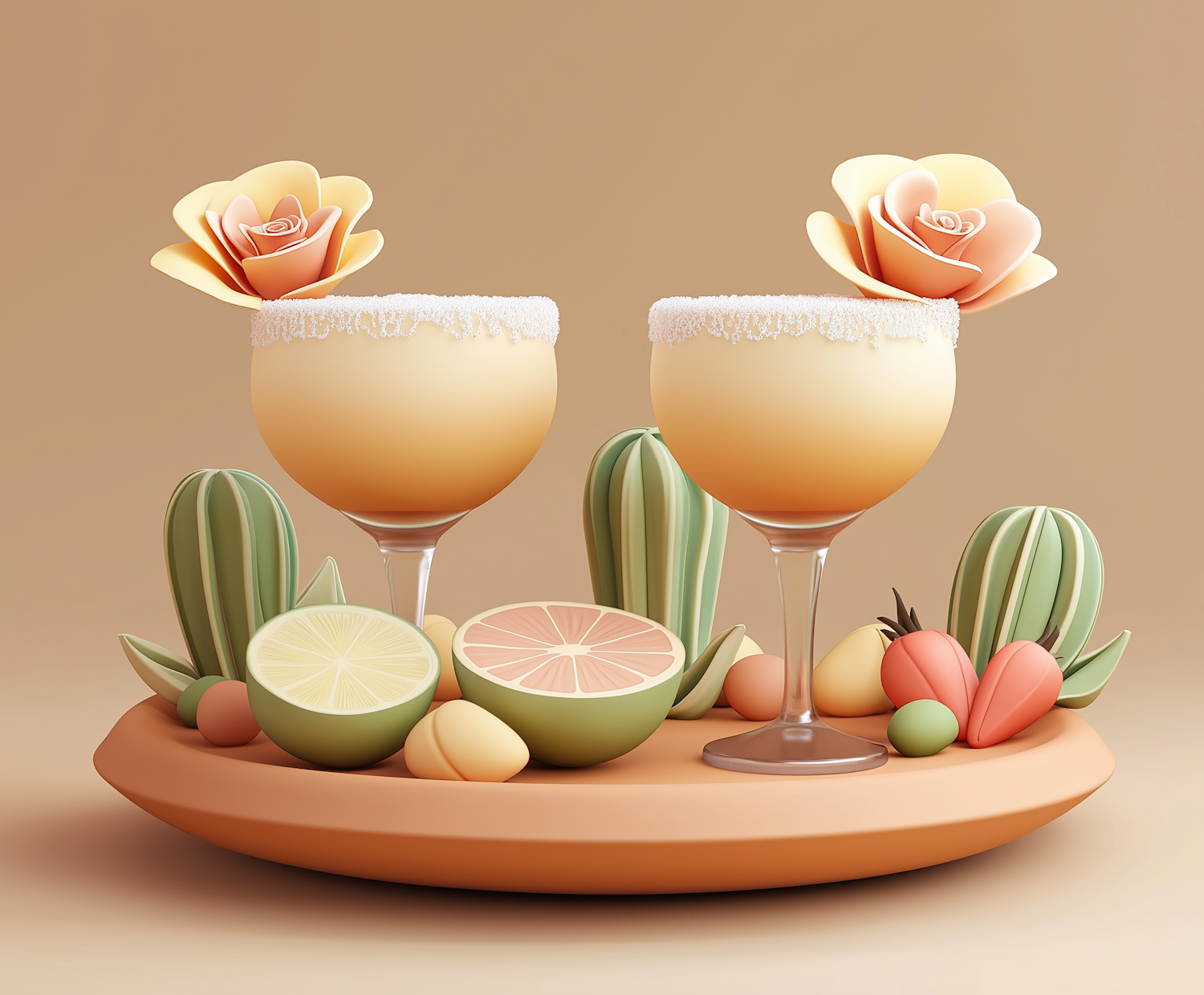 Artistic cocktail scene with two glasses, sugar rims, and paper roses, surrounded by pastel fruits and cacti on a terracotta platter.