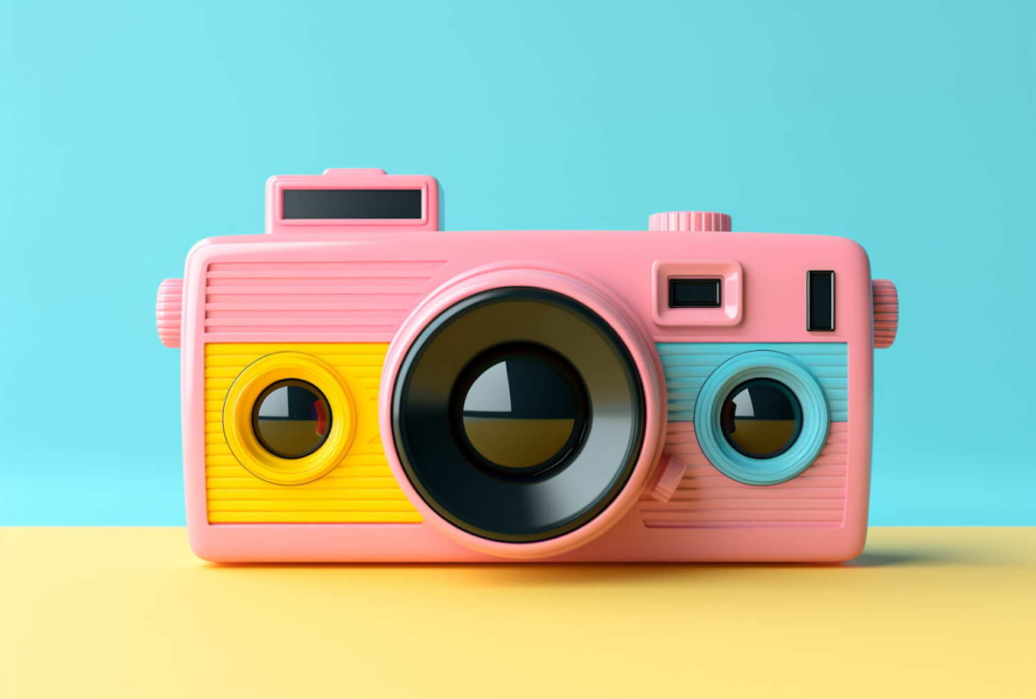 Colorful retro camera with pink, yellow, and blue design against a turquoise and yellow background.