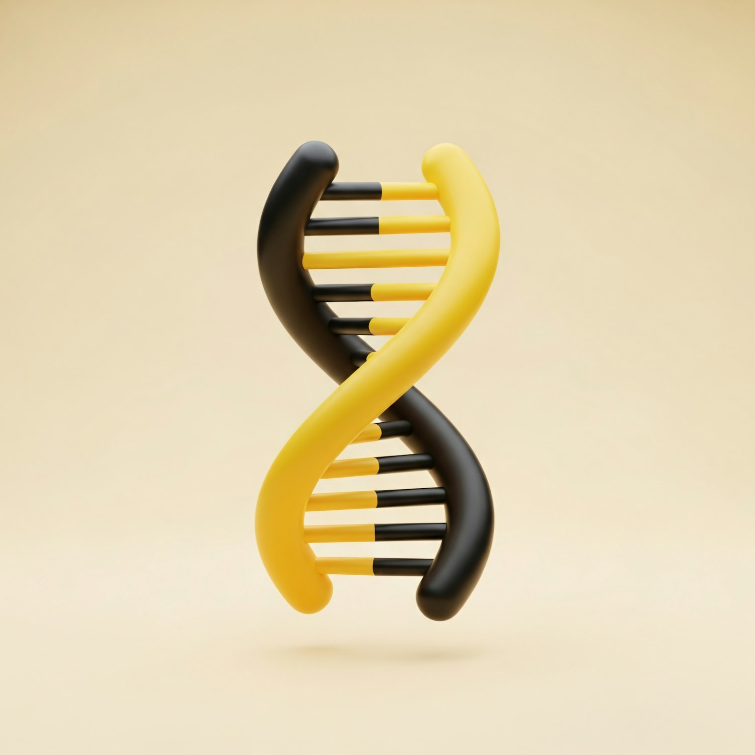 A 3D-rendered DNA helix with black and yellow strands on a beige background, showcasing a clean and modern design.