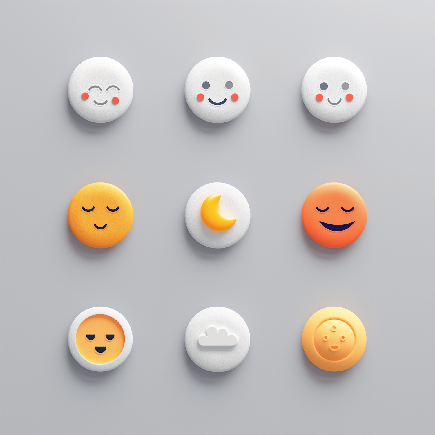 A grid of nine playful emoji icons with smiling faces, moons, and clouds on a light gray background.