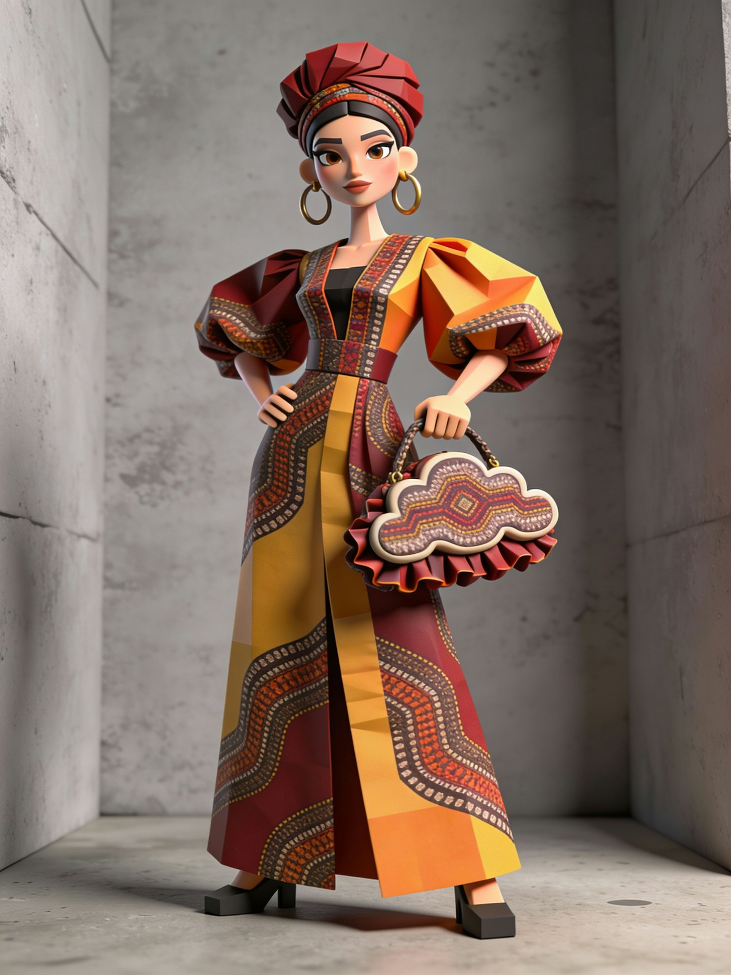 Stylized 3D character in vibrant traditional attire with geometric patterns, accessorized with a matching headwrap and handbag.