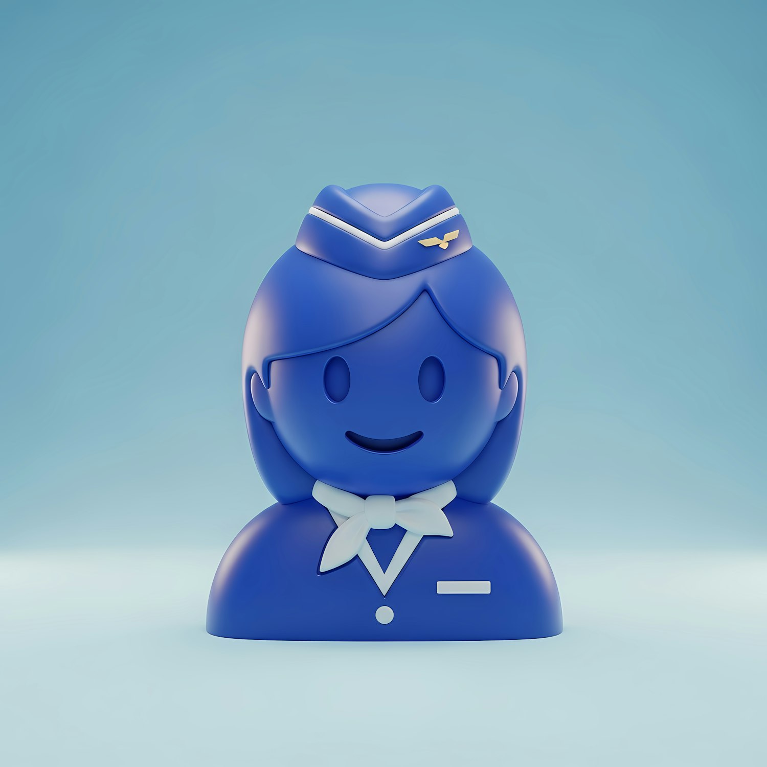 3D illustration of a flight attendant icon in blue with a hat and scarf, set against a light blue gradient background.
