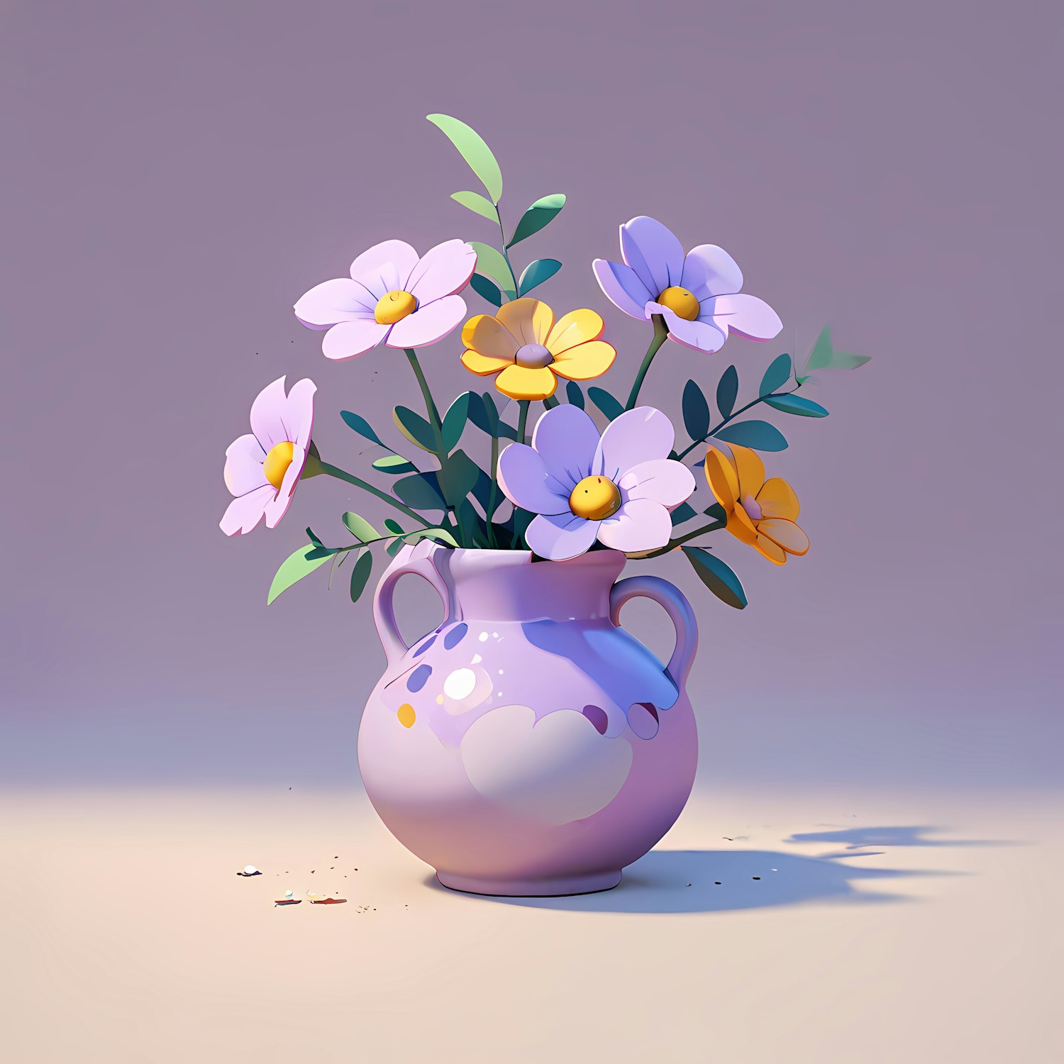 Charming illustration of a lavender vase with pastel flowers and green leaves on a light surface, set against a muted gray background.