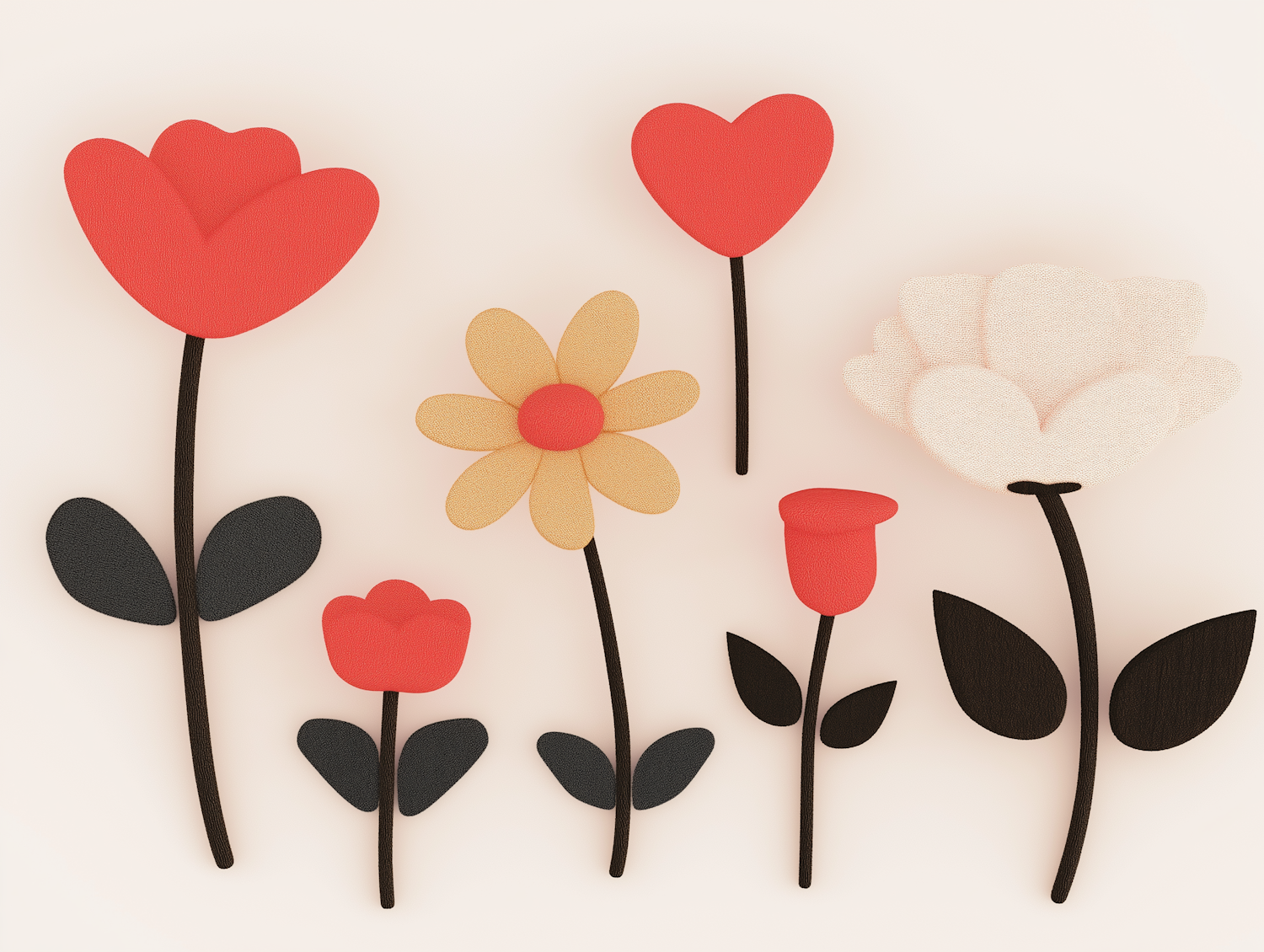 Minimalist illustration of colorful stylized flowers with bold shapes and contrasting dark stems on a light background.