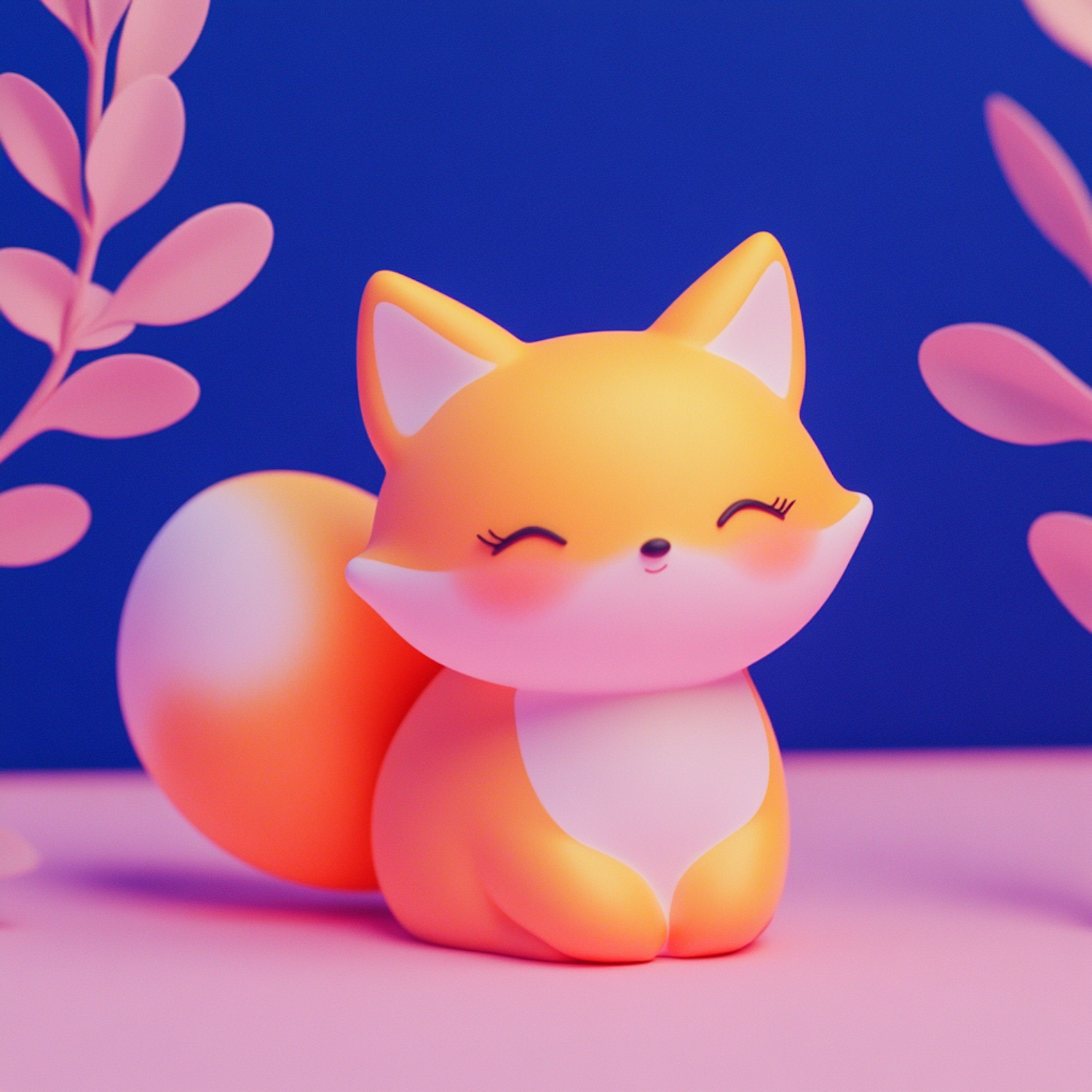 Adorable cartoon-style fox figurine with orange and white tones, set against a bold blue and pink whimsical background.