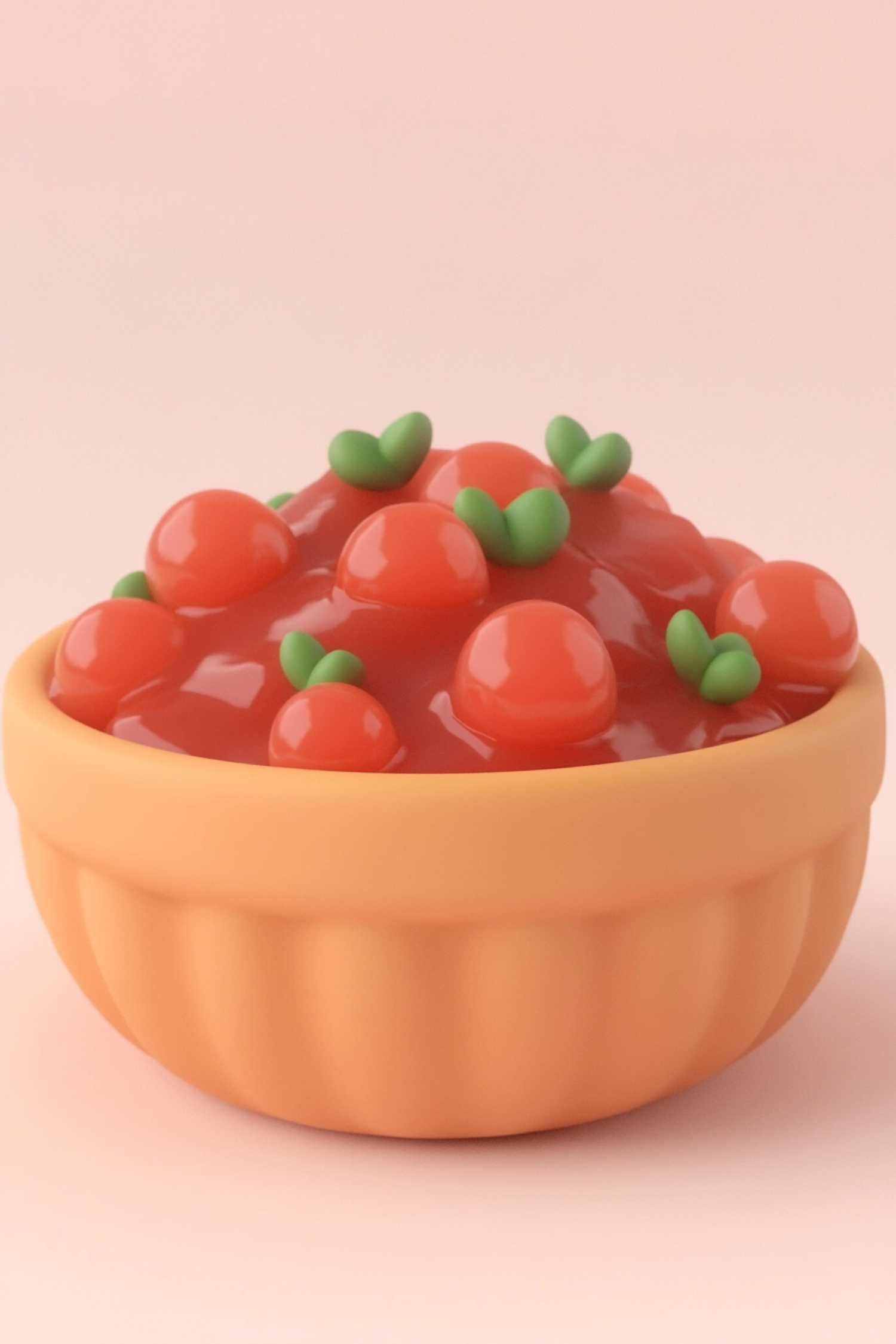 3D illustration of a bowl with glossy red sauce and cherry-like objects, topped with green leaves, on a soft pink background.