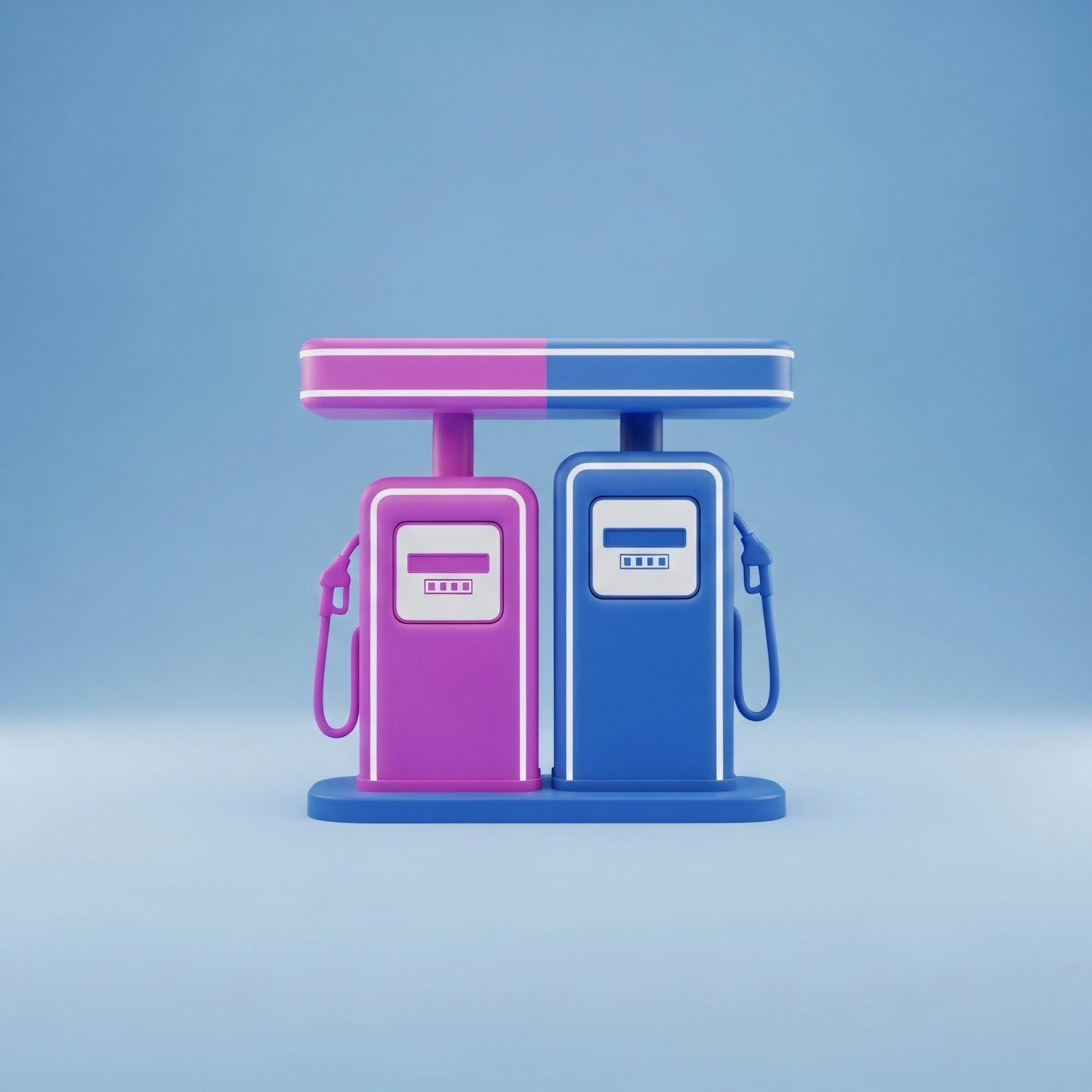 A vibrant 3D illustration of pink and blue fuel pumps against a light blue background, showcasing a modern and minimalistic design.