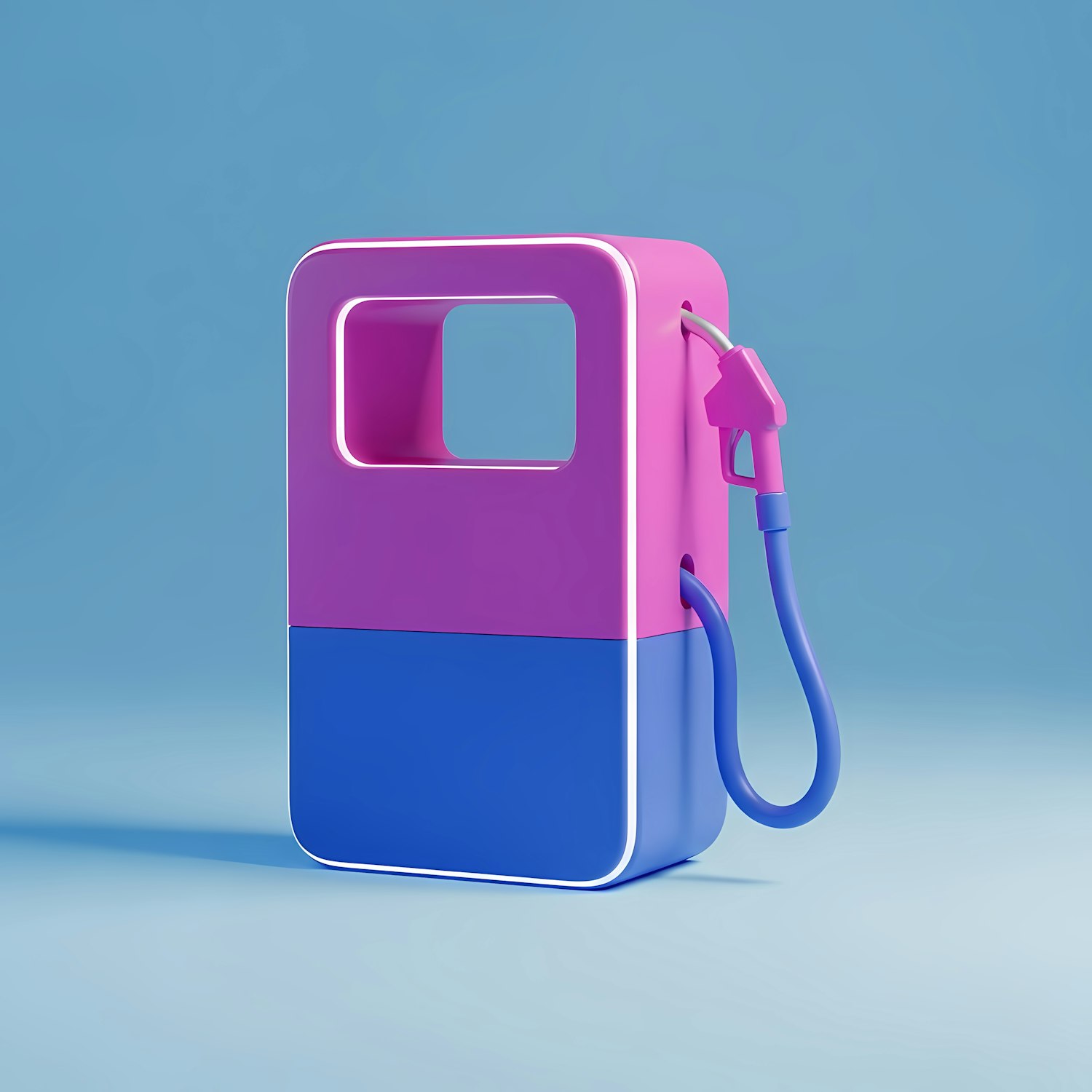 Bright and modern 3D illustration of a pink and blue gas pump with a clean, minimalistic design against a light blue background.