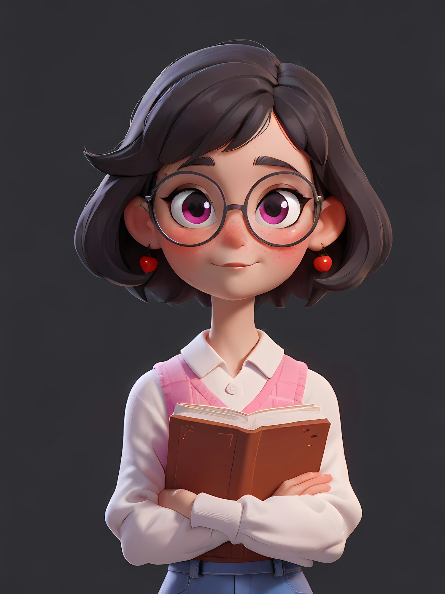 Charming 3D illustration of a studious girl with glasses, cherry earrings, and a book, wearing a pink sweater vest and white shirt.