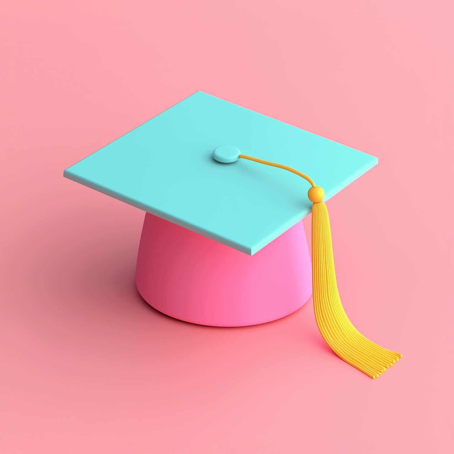 Stylized turquoise graduation cap with yellow tassel on a pink background, creating a modern and playful aesthetic.