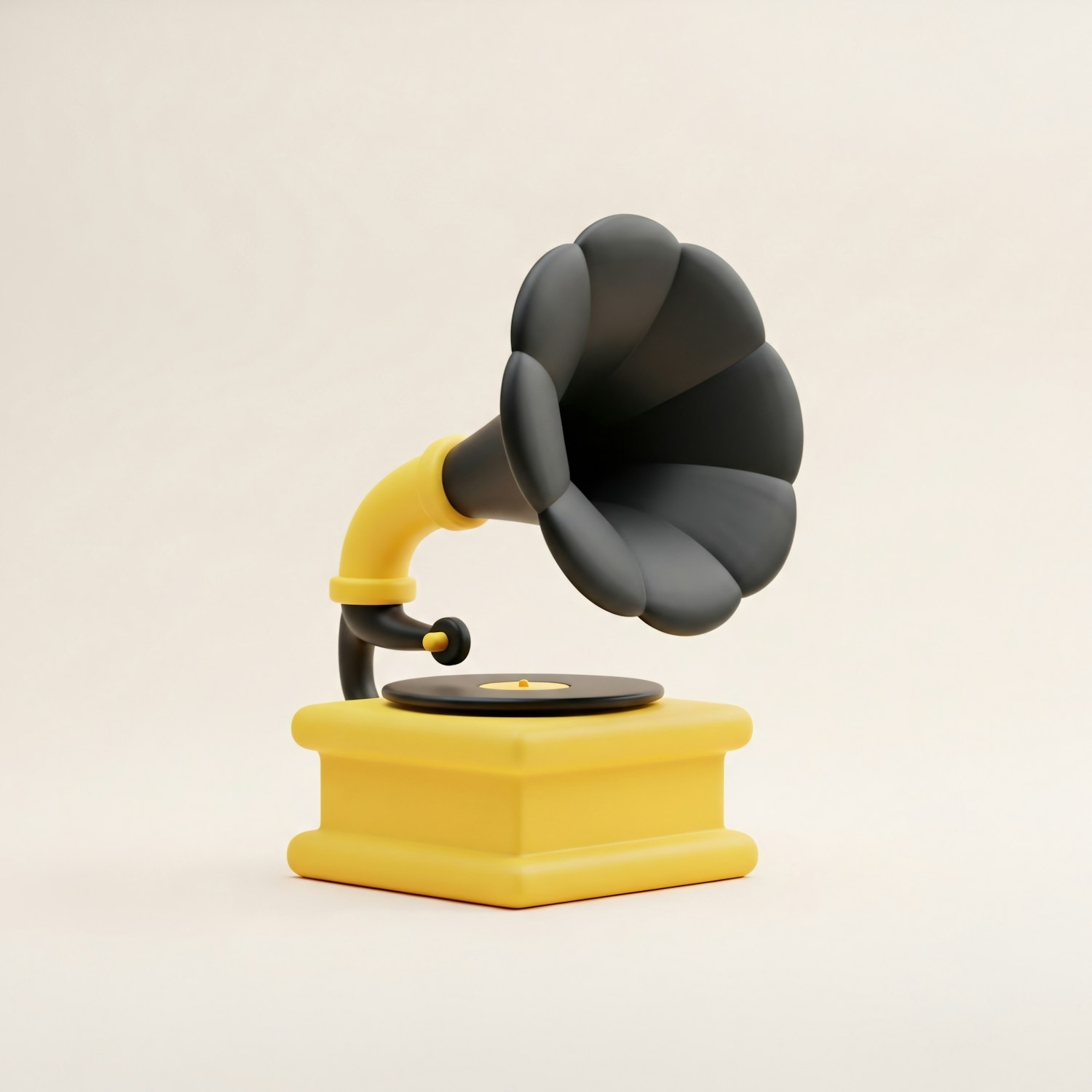 A vibrant 3D-rendered gramophone with a yellow base and black horn, blending retro charm with modern design in a minimalist style.