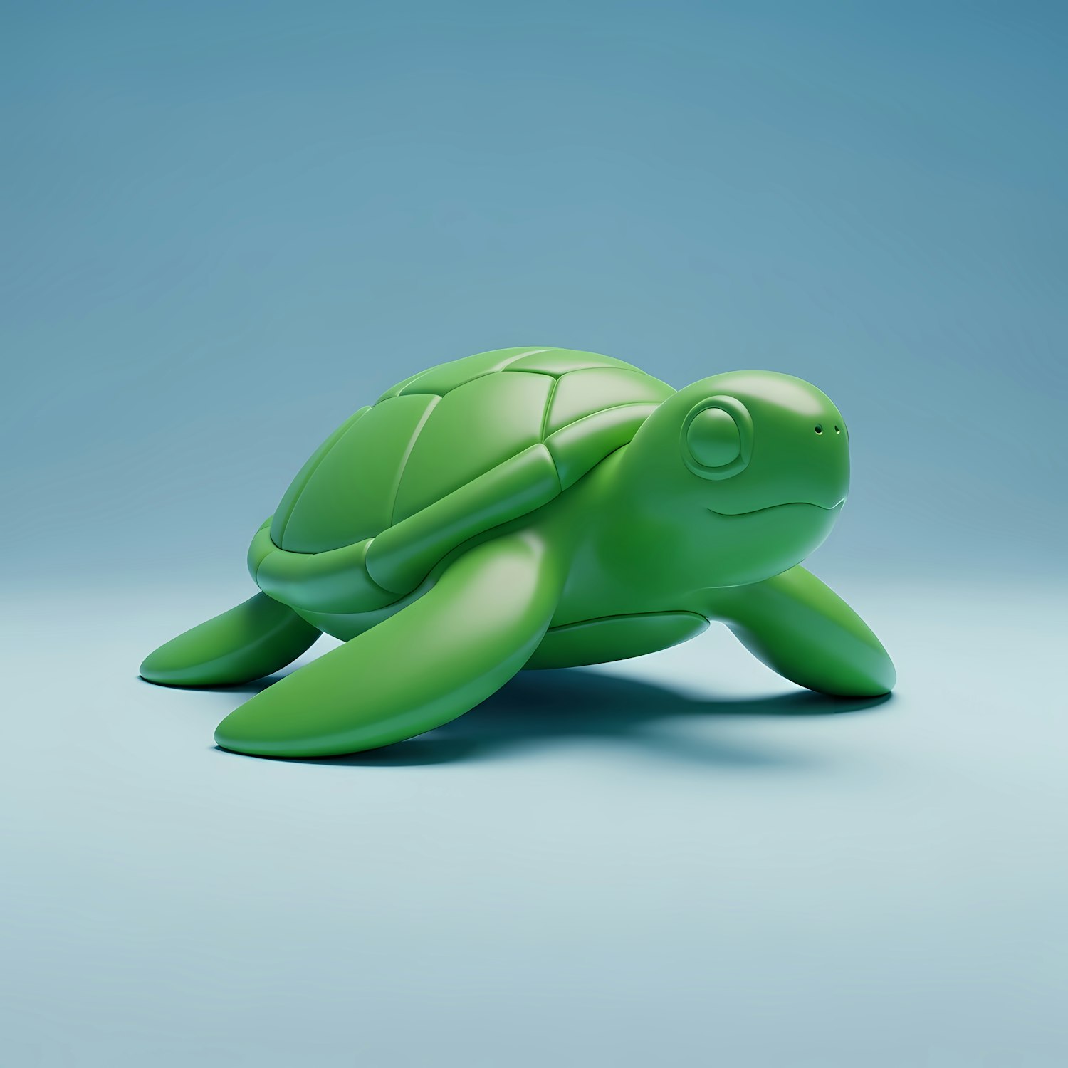 A stylized 3D green turtle with a glossy finish, set against a gradient blue background, showcasing a modern and polished design.