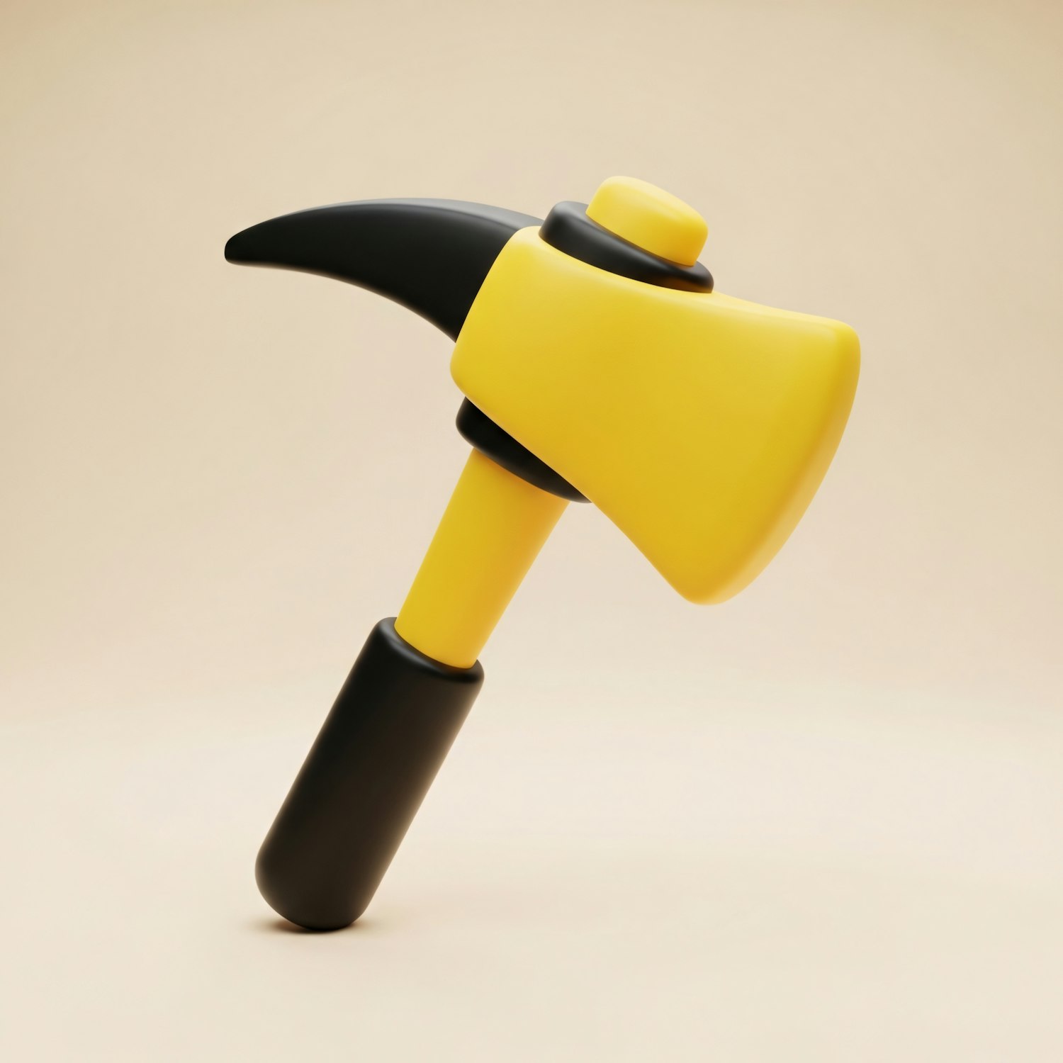 A vibrant 3D-rendered hammer with a yellow head and black handle, displayed on a soft beige background.