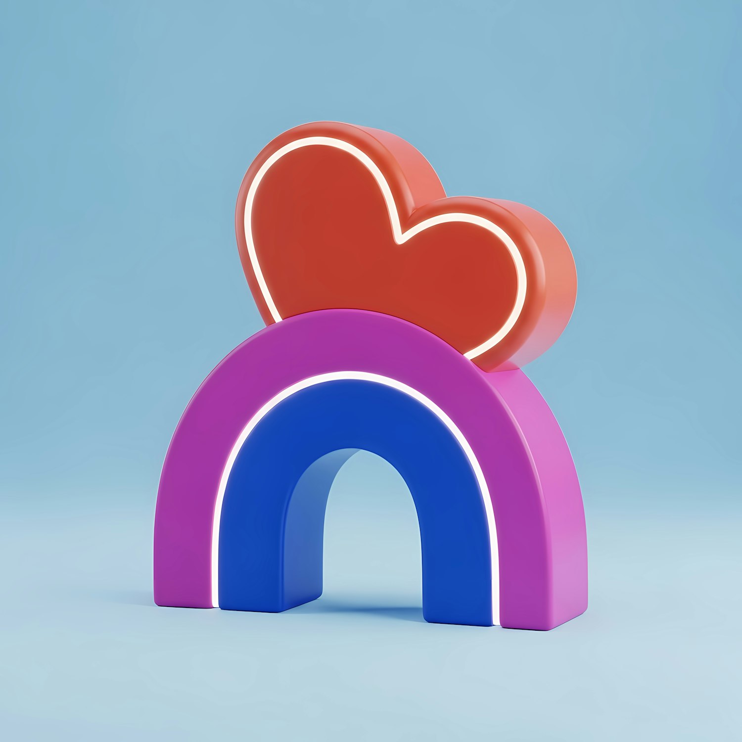 A 3D-rendered red heart atop a glowing pink and blue arch on a light blue background, creating a vibrant and modern design.