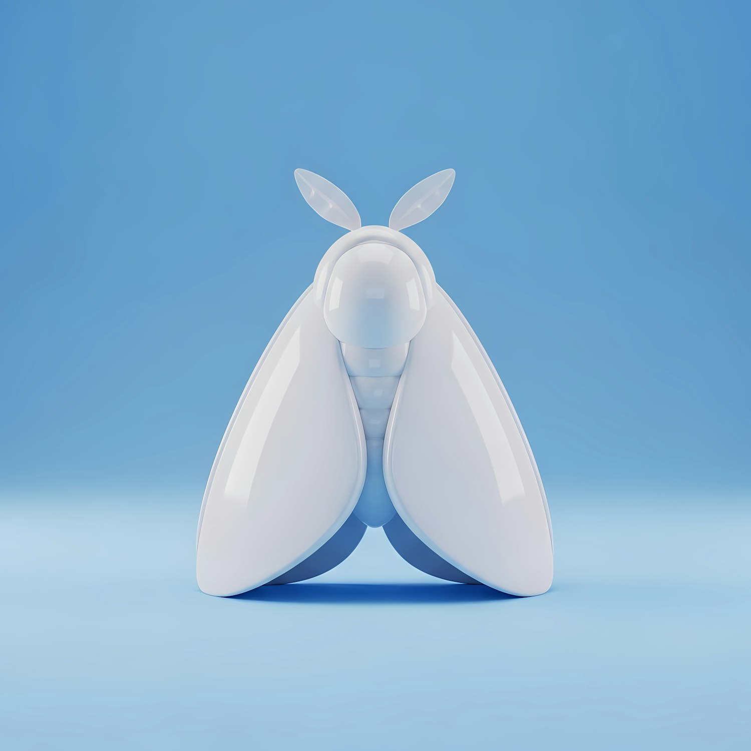 A sleek 3D rendering of a white, insect-inspired design with glossy surfaces, set against a clean blue background.