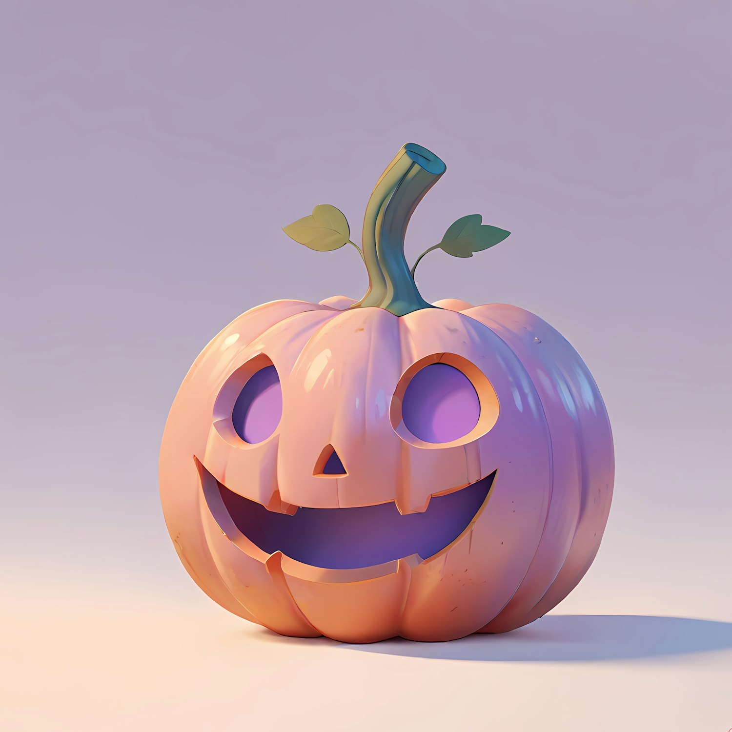 Charming 3D illustration of a smiling carved pumpkin with a glossy finish and soft pastel background.