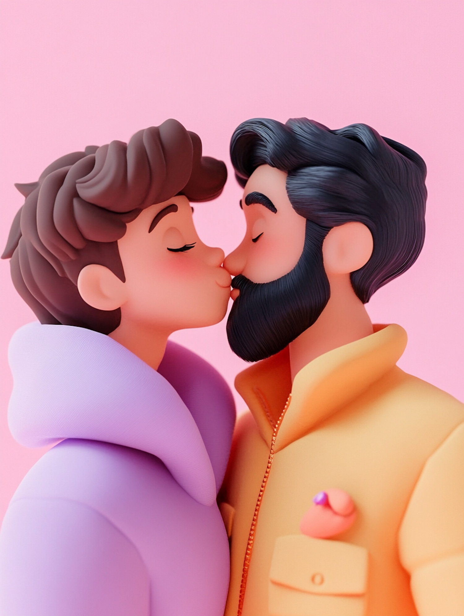 Cartoon-style illustration of two characters sharing a kiss, one in a purple hoodie and the other in a yellow jacket, against a pink background.