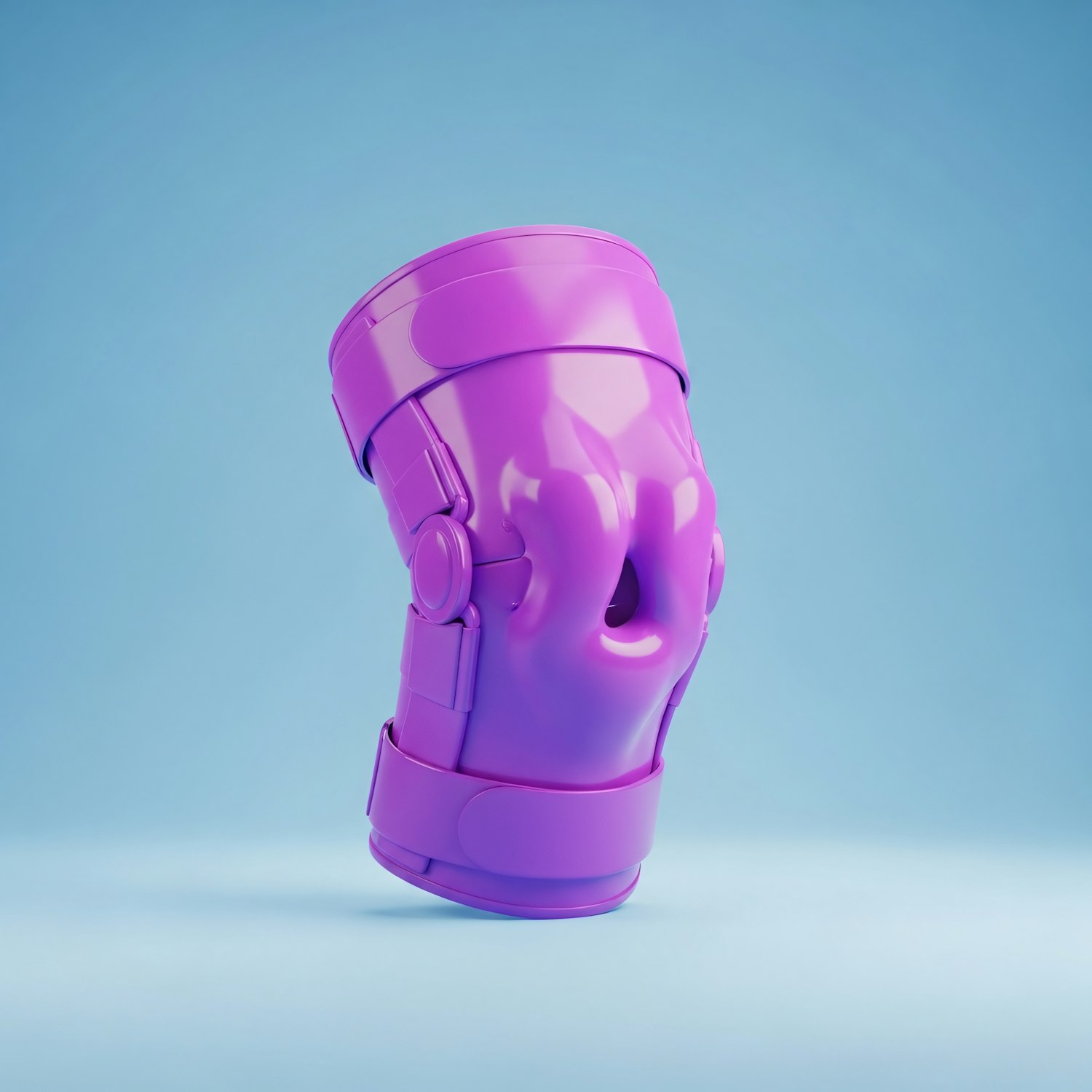 A sleek purple knee brace design with a glossy finish, set against a clean blue gradient background, showcasing modern aesthetics.