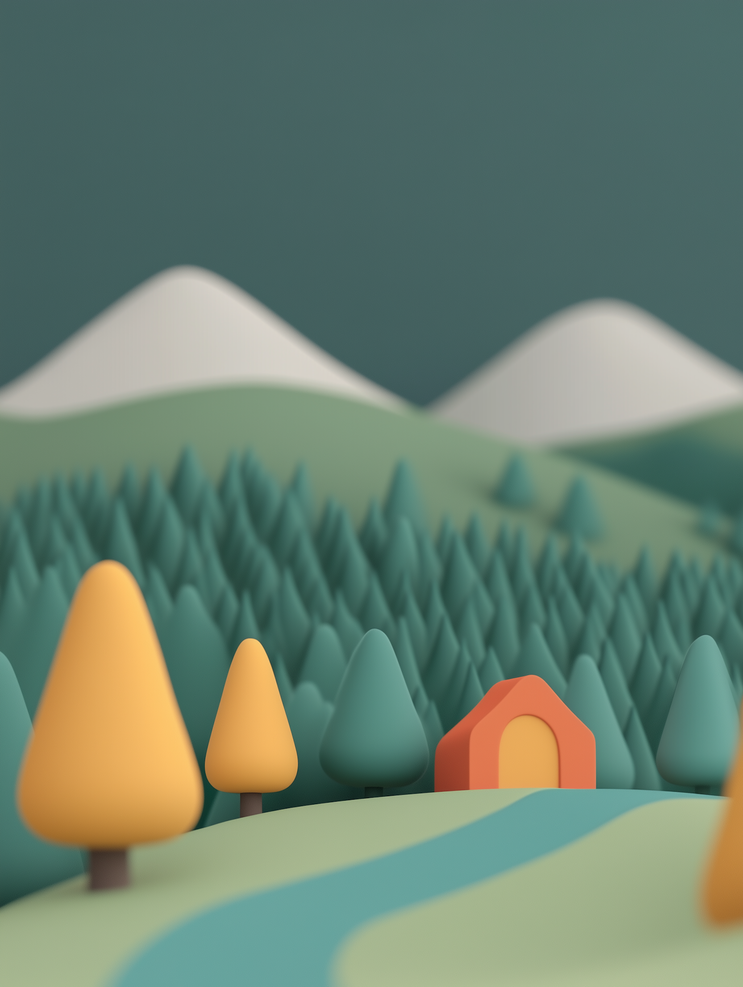 Stylized landscape with a small orange house, colorful trees, a winding river, and distant mountains under a teal sky.