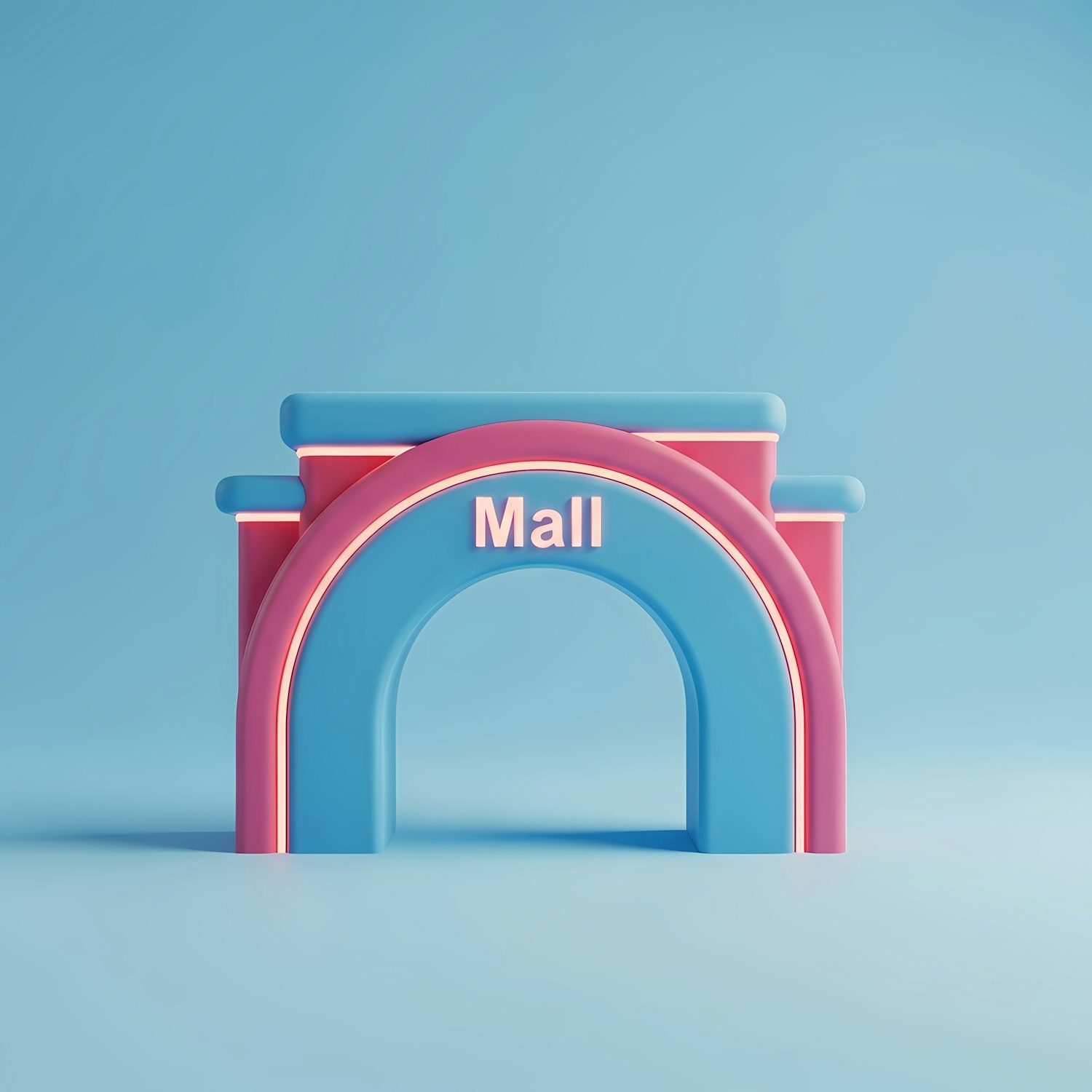 A vibrant 3D illustration of a mall entrance with a blue and pink archway and 'Mall' in illuminated letters on a light blue background.