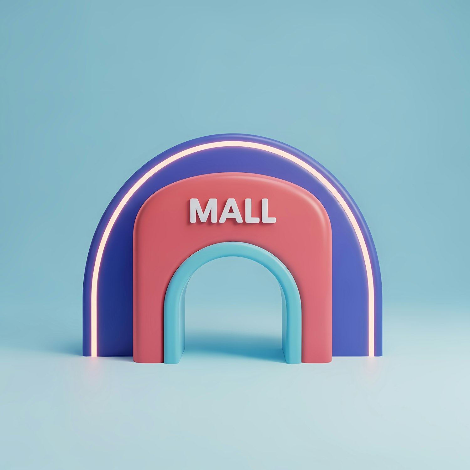 A colorful 3D illustration of a mall entrance with a pink and blue arch and 'MALL' text, set against a light blue background.