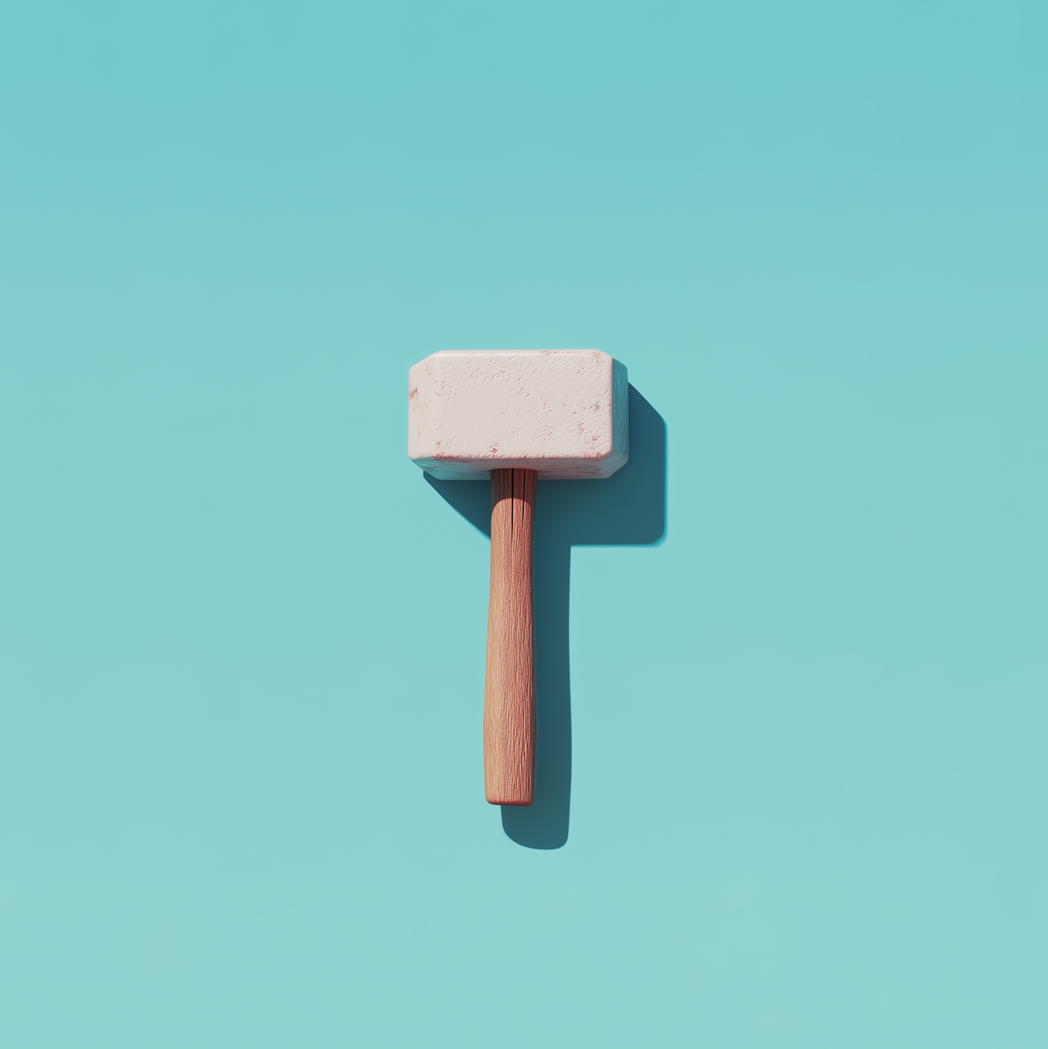 Minimalist image of a wooden mallet on a turquoise background, highlighting its texture and shadow.
