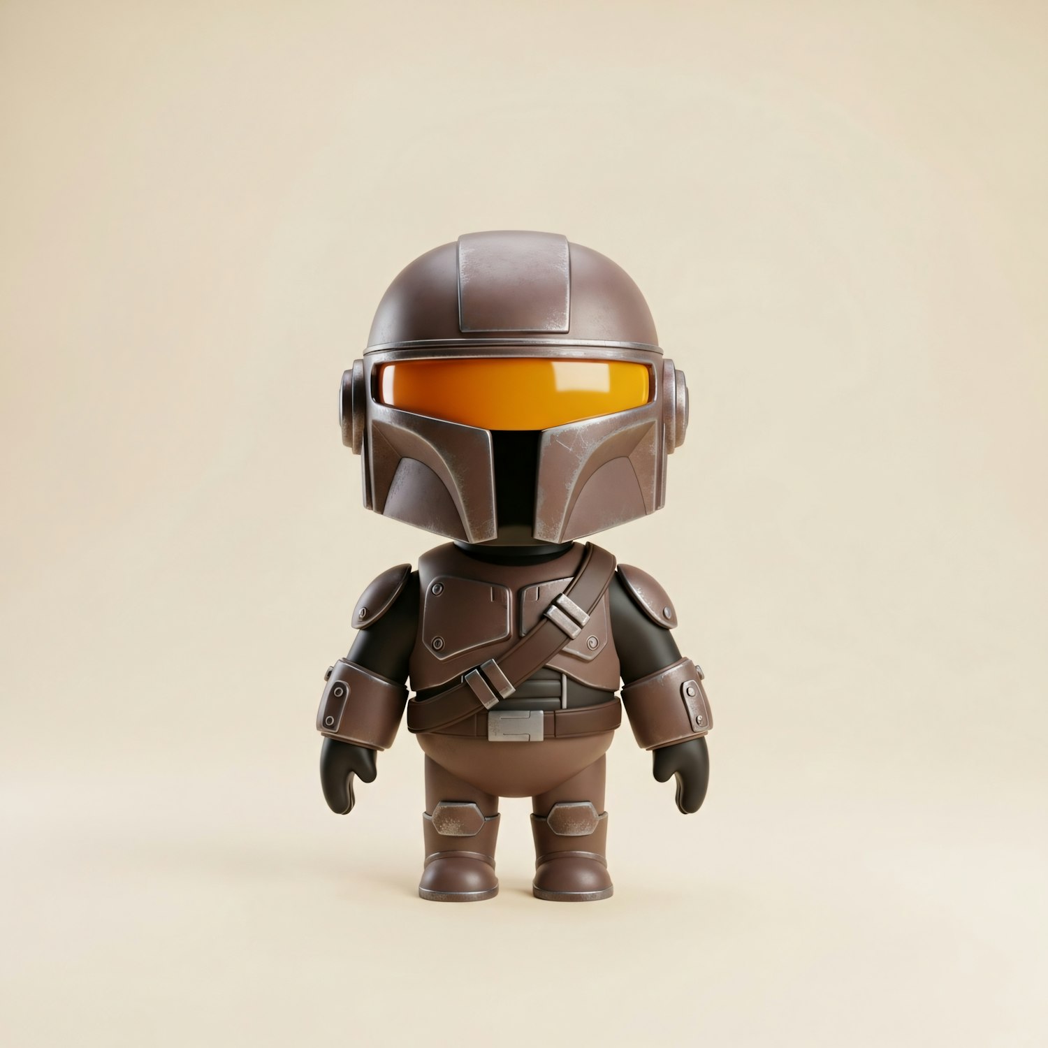 A cute 3D-rendered Mandalorian-inspired character with a metallic brown helmet and orange visor, set against a neutral background.
