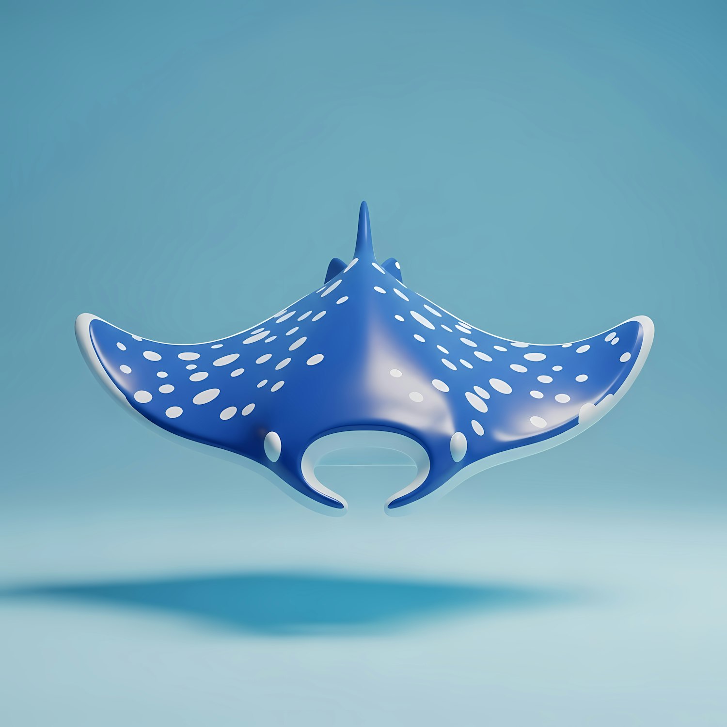 A vibrant 3D-rendered manta ray with a blue body and white spots, set against a minimalistic light blue background.