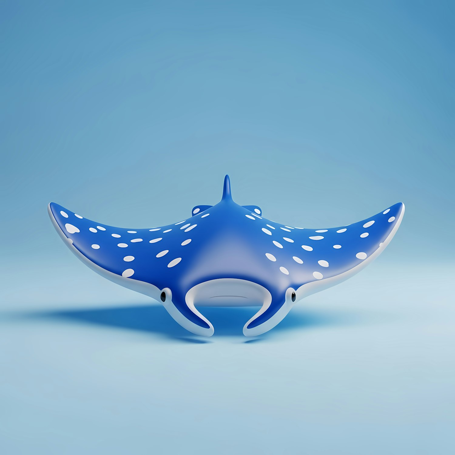 A vibrant 3D-rendered manta ray with blue and white patterns, set against a gradient blue background, showcasing sleek and modern design.