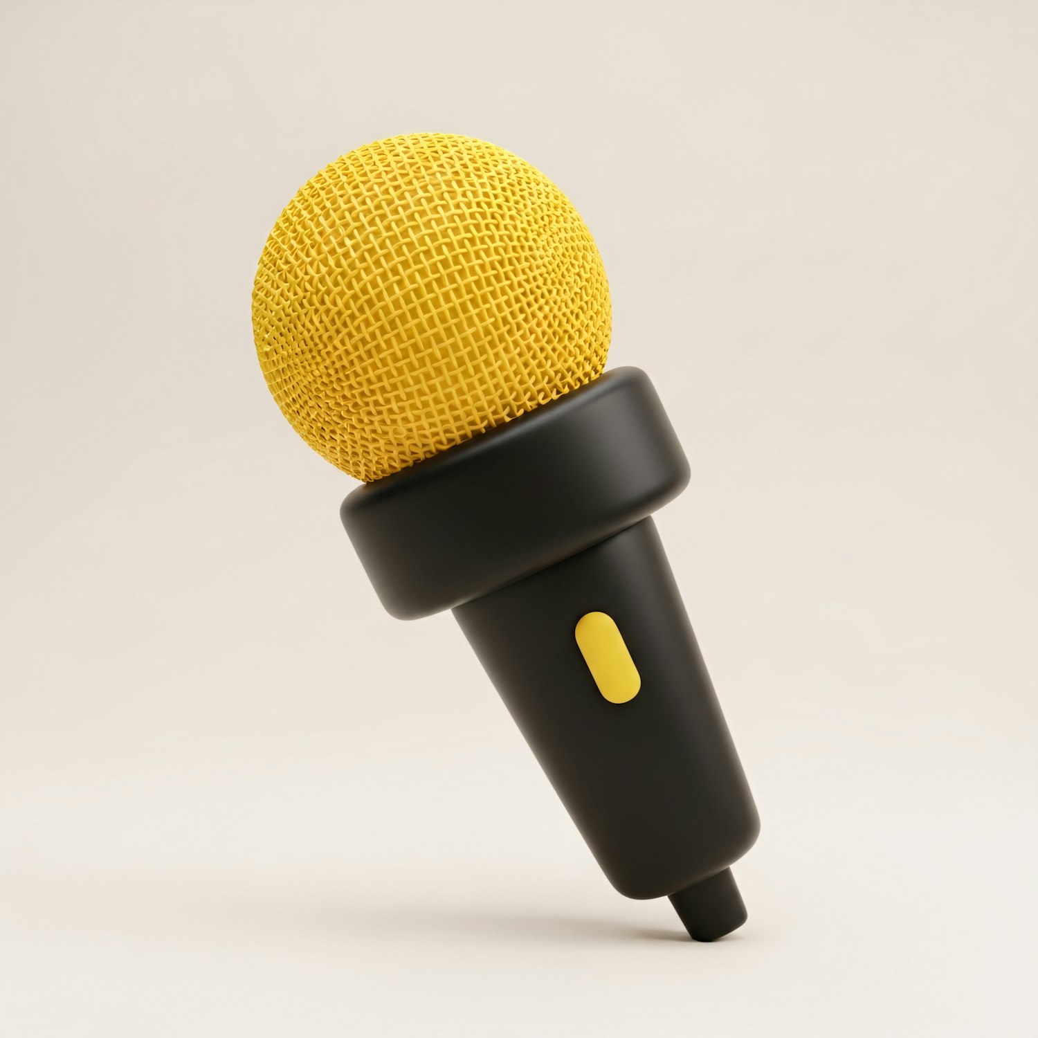 A 3D-rendered microphone with a yellow mesh head and black body, set against a beige background, showcasing a modern and vibrant design.