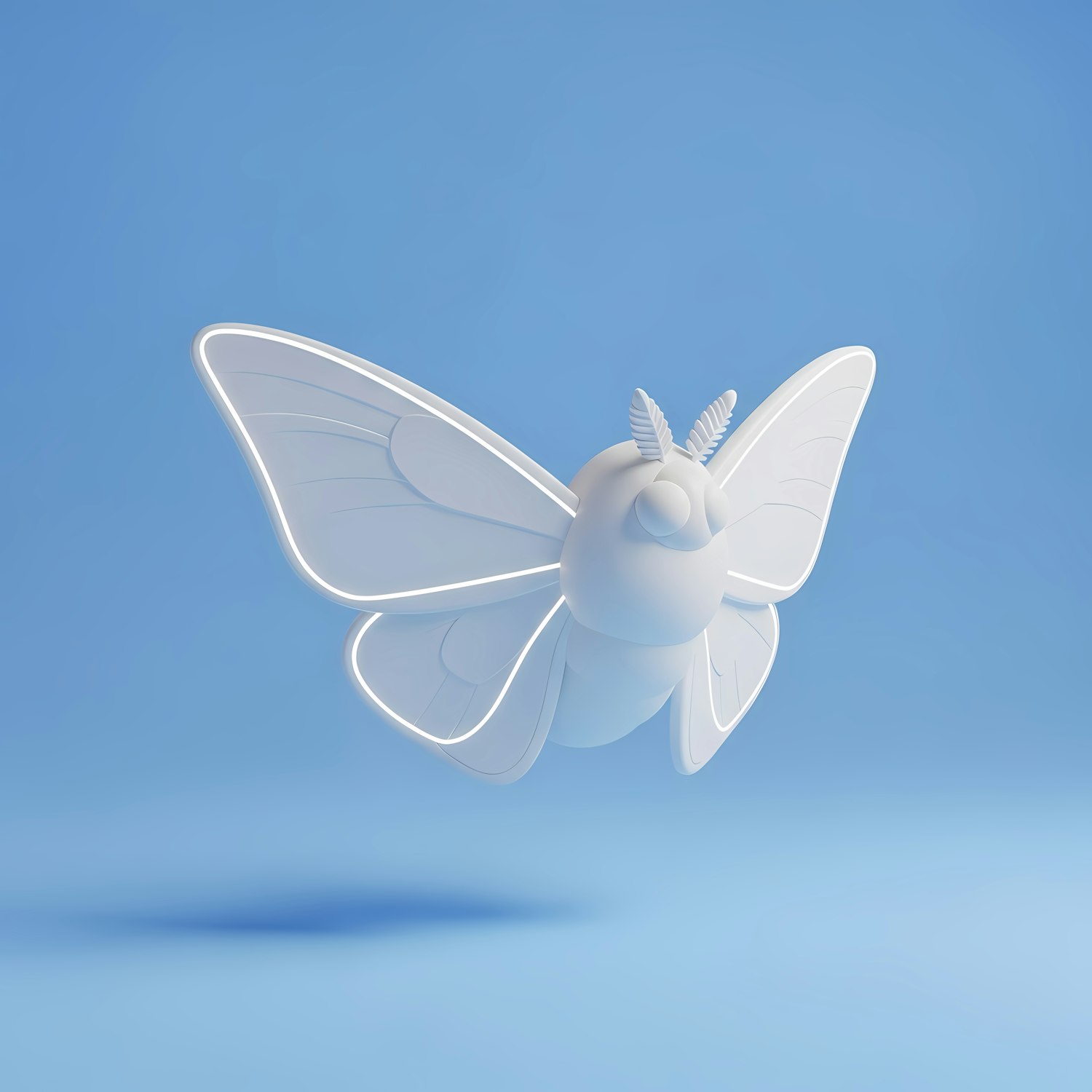 A sleek 3D-rendered white moth with glowing outlines, set against a clean blue background, showcasing a modern and minimalistic design.
