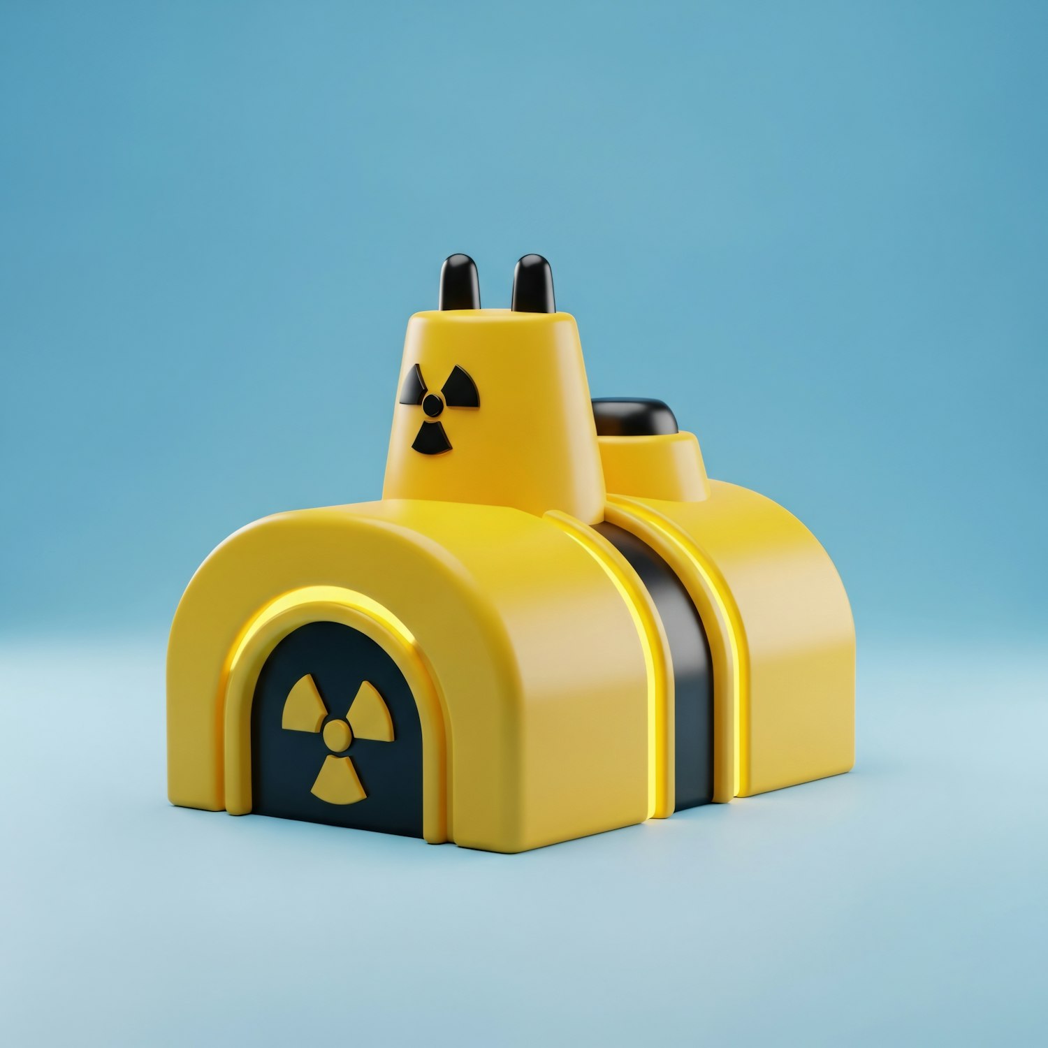 A vibrant 3D model of a yellow building with radiation symbols, set against a clean blue background, showcasing a stylized design.