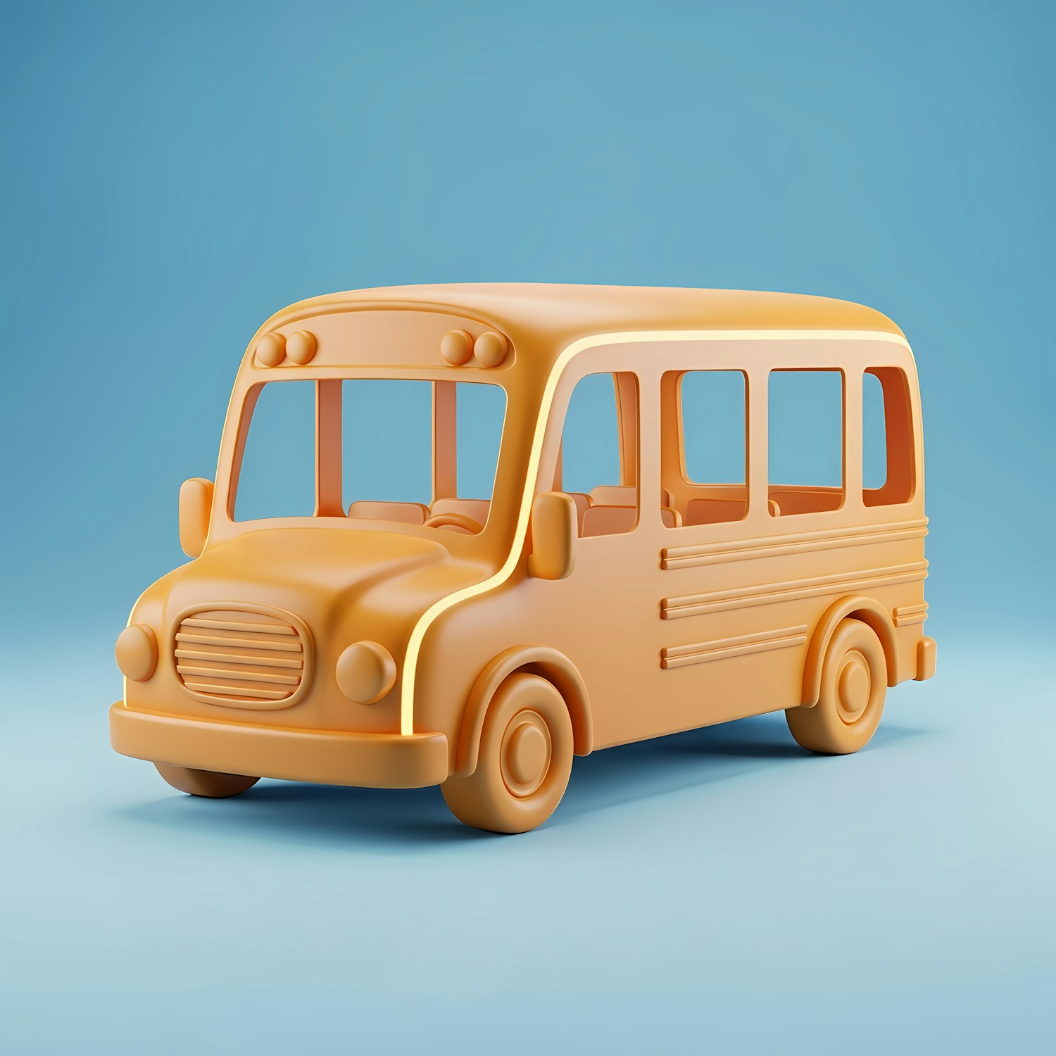 A cute 3D orange toy bus with a cartoonish design on a light blue background, perfect for playful and creative projects.