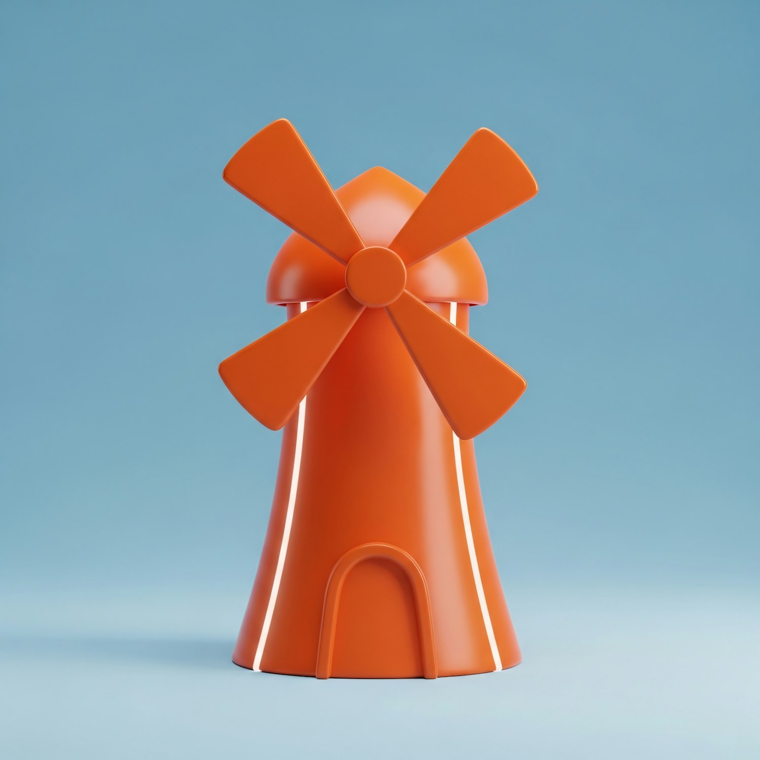 A vibrant orange windmill with a modern design set against a light blue background, showcasing a playful and minimalistic aesthetic.