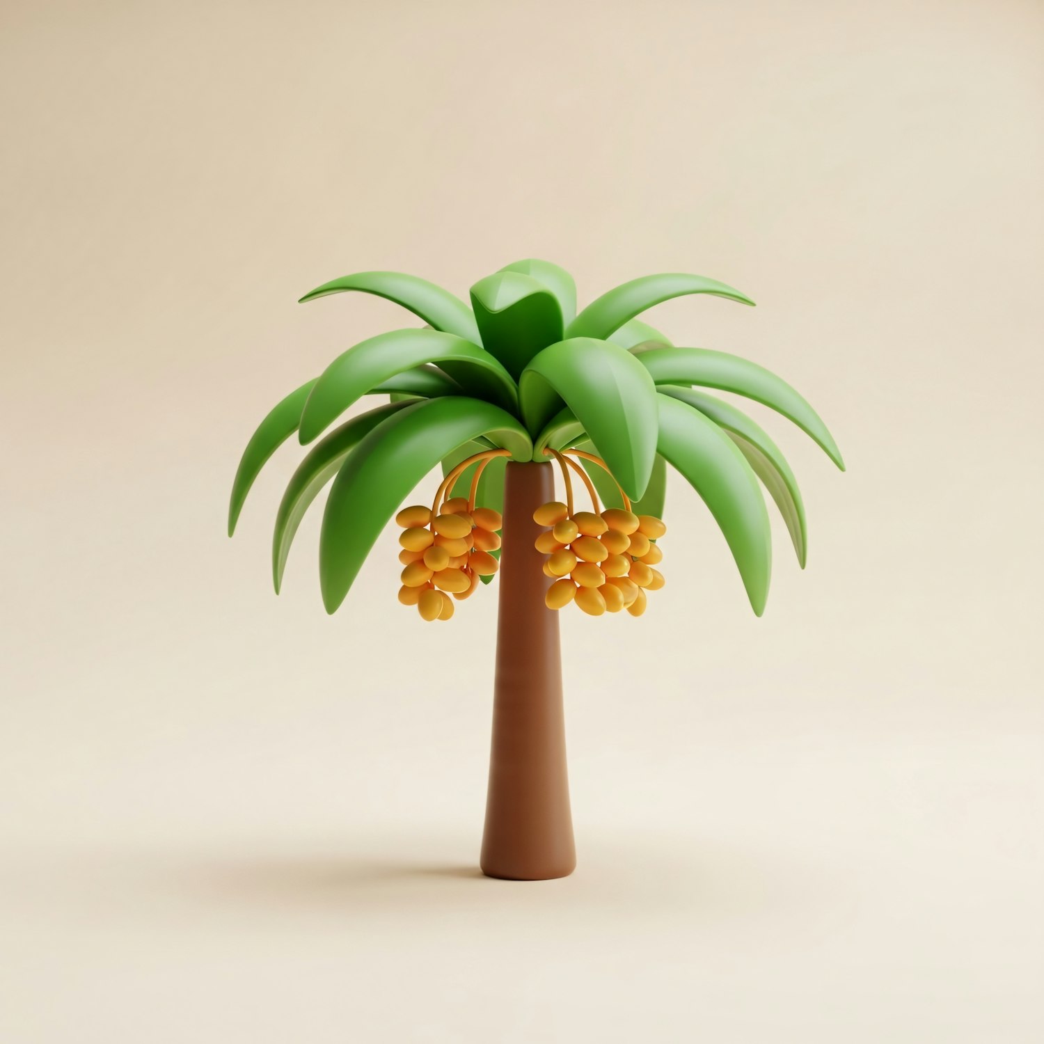 A minimalistic 3D palm tree with green fronds and golden dates on a beige background, perfect for design and decorative themes.
